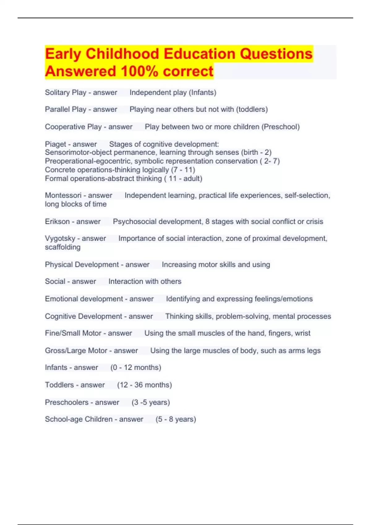 Early Childhood Education Questions Answered 100% correct Solitary Play Independent play (Infants) Parallel Play Playing near others but not with (toddlers) Cooperative Play Play between two or more children (Preschool) Piaget Stages of cognitive development: Sensorimotor-object permanence, learning through senses (birth - 2) Preoperational-egocentric, symbolic representation conservation ( 2- 7) Concrete operations-thinking logically (7 - 11) Formal operations-abstract thinking ( 11 - adult) Montessori Independent learning, practical life experiences, self-selection, long blocks of time Erikson Psychosocial development, 8 stages with social conflict or crisis Vygotsky Importance of social interaction, zone of proximal development, scaffolding Physical Development Increasing motor skills and using Social Interaction with others Emotional development Identifying and expressing feelings/emotions Cognitive Development Thinking skills, problem-solving, mental processes Fine/Small Motor Using the small muscles of the hand, fingers, wrist Gross/Large Motor Using the large muscles of body, such as arms legs Infants (0 - 12 months) Toddlers (12 - 36 months) Preschoolers (3 -5 years) School-age Children (5 - 8 years) Anecdotal Records/Notes An observer's reports of a child's actions, usually concentrating on a specific behavior or area of development Transitions Periods in an early childhood classroom during which children move from one activity to the next Sensory Table Table in the sensory area that gives children the opportunity to experience the sensations related to water and sand. Also known as a water or sand table Brain development/Connections How the brain develops in a baby's first year of life has profound effects on the baby's whole life, by first birthday, 75 percent of brain's wiring will be completed Fire Drills Performed every 30 days Pre-Reading/Reading Print awareness, Book handling skills, Sound and rhythms of spoken language, Letter knowledge, Vocabulary development, Comprehending stories. READING SKILLS: Use knowledge of letter sounds to solve unknown words, uses language, memory, pictures, and print as major cues to read and understand text, analyzes new words and checks them against what makes sense and sounds rights, begins to retell the major points of the text. Stages of Writing Progresses from using scribbles, shapes, and pictures to represent ideas, to using letter-like symbols, to copying or writing familiar words such as their own name. Use inventive and phonetic writing to form words to convey ideas or tell a story. Manipulatives Official definition of 'manipulate' means 'to treat or operate with or as with the hands or by mechanical means especially in a skillful manner.' Educational math manipulatives are things the children can actually touch and pick up with their hands. They come in all shapes, colors and sizes. Manipulatives can give the student a three dimensional hands-on picture of the concepts they are learning. Manipulatives are usually cubes, rods, tiles or cards with or without numbers on them. Cultural Diversity The National Association for the Education of Young Children's (NAEYC) recommendations emphasize that early childhood programs are responsible for creating a welcoming environment that respects diversity, supports children's ties to their families and community, and promotes both second language acquisition and preservation of children's home languages and cultural identities. School age Classroom Environment Classroom space arranged for cooperative learning/play Toddler Classroom Environment Toys are easily accessible to children multiples of favorite toys Small/Whole Group Small group of 3 -5 children Whole group - the entire class of children Scaffolding A Play Sequence The process of structuring the learning experiences around existing knowledge and offering challenge that is just beyond the child's current level of understanding and ability.
