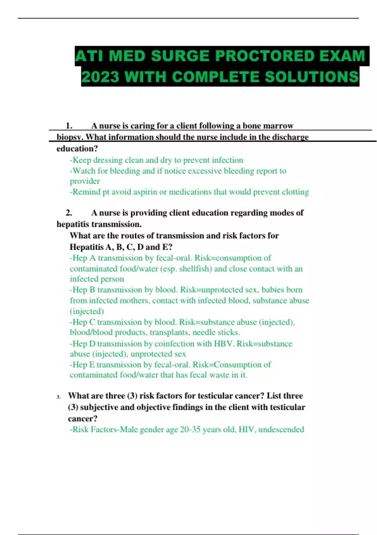 ATI MED SURGE PROCTORED EXAM 2023 WITH COMPLETE SOLUTIONS 1. A nurse is caring for a client following a bone marrow biopsy. What information should the nurse include in the discharge education? -Keep dressing clean and dry to prevent infection -Watch for bleeding and if notice excessive bleeding report to provider -Remind pt avoid aspirin or medications that would prevent clotting 2. A nurse is providing client education regarding modes of hepatitis transmission. What are the routes of transmission and risk factors for Hepatitis A, B, C, D and E? -Hep A transmission by fecal-oral. Risk=consumption of contaminated food/water (esp. shellfish) and close contact with an infected person -Hep B transmission by blood. Risk=unprotected sex, babies born from infected mothers, contact with infected blood, substance abuse (injected) -Hep C transmission by blood. Risk=substance abuse (injected), blood/blood products, transplants, needle sticks. -Hep D transmission by coinfection with HBV. Risk=substance abuse (injected), unprotected sex -Hep E transmission by fecal-oral. Risk=Consumption of contaminated food/water that has fecal waste in it. 3. What are three (3) risk factors for testicular cancer? List three (3) subjective and objective findings in the client with testicular cancer? -Risk Factors-Male gender age 20-35 years old, HIV, undescended testis. -Subjective findings-swelling/lump in testis, indication of metastases such as gynecomastia and back pain. -Objective findings-swollen lymph nodes in groin area, palpable lump by LIP, enlarged testis without presence of pain. 4. What dietary education should the nurse provide to a client diagnosed with a hiatal hernia? -Avoid fatty, fried foods, coffee and caffeinated beverages, spicy foods, citrus fruits, acidic vegetables such as tomatoes, and ETOH. 5. A nurse is caring for a client with chronic gastritis. Provide three (3) dietary recommendations the nurse should include in client education? -Eat small frequent meals, eat slowly, avoid food and beverages that cause gastric irritation, decrease consumption or eliminate caffeine and ETOH.