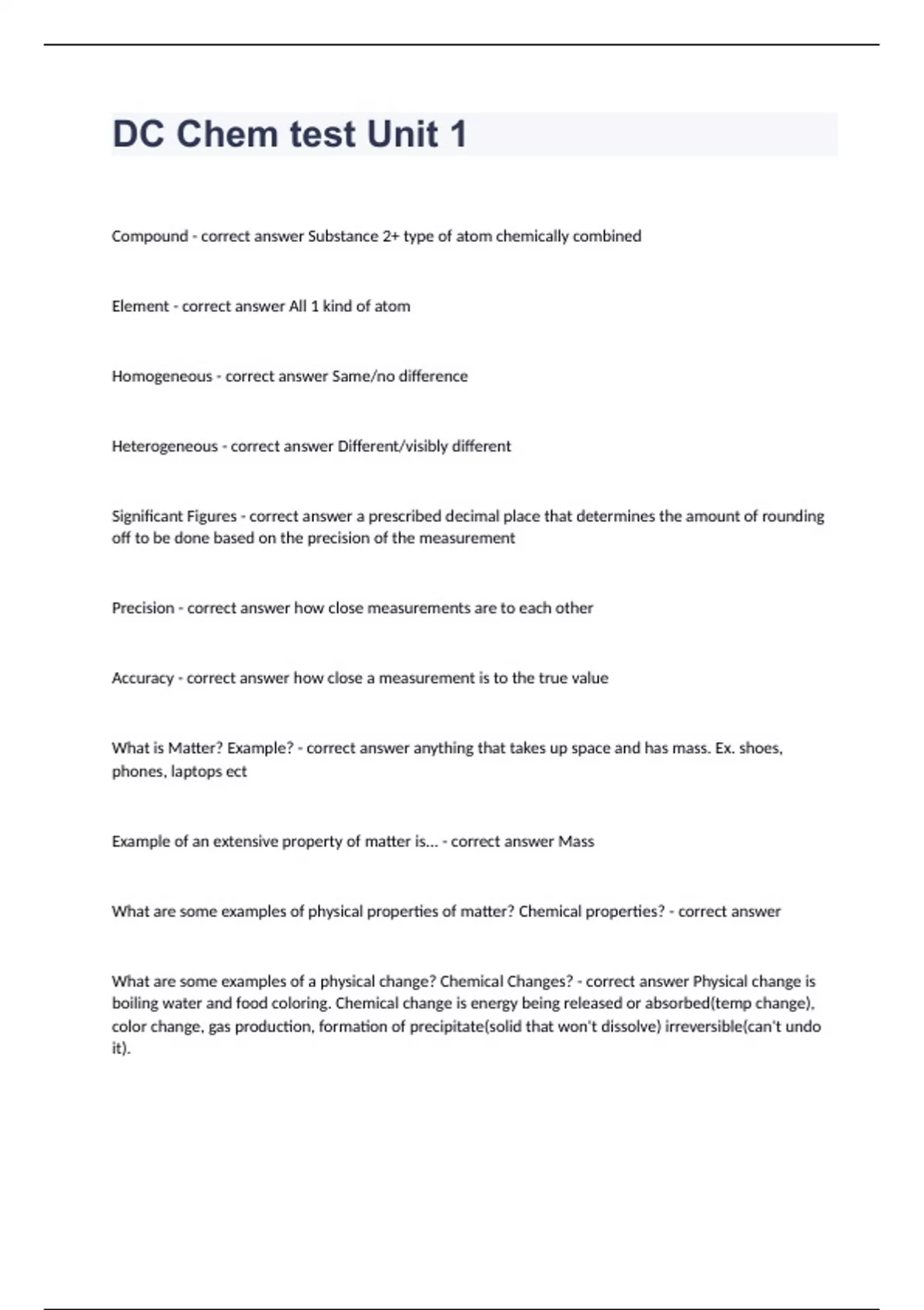 DC Chem test Unit 1 correctly answered rated A+ 2023