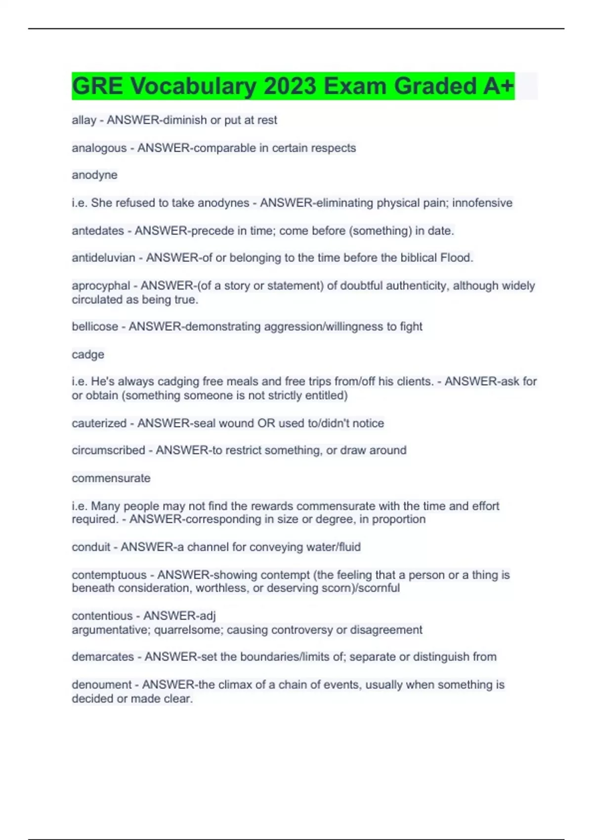 allay - ANSWER-diminish or put at rest analogous - ANSWER-comparable in certain respects anodyne i.e. She refused to take anodynes - ANSWER-eliminating physical pain; innofensive antedates - ANSWER-precede in time; come before (something) in date. antideluvian - ANSWER-of or belonging to the time before the biblical Flood. aprocyphal - ANSWER-(of a story or statement) of doubtful authenticity, although widely circulated as being true. bellicose - ANSWER-demonstrating aggression/willingness to fight cadge i.e. He's always cadging free meals and free trips from/off his clients. - ANSWER-ask for or obtain (something someone is not strictly entitled) cauterized - ANSWER-seal wound OR used to/didn't notice circumscribed - ANSWER-to restrict something, or draw around commensurate i.e. Many people may not find the rewards commensurate with the time and effort required. - ANSWER-corresponding in size or degree, in proportion conduit - ANSWER-a channel for conveying water/fluid contemptuous - ANSWER-showing contempt (the feeling that a person or a thing is beneath consideration, worthless, or deserving scorn)/scornful contentious - ANSWER-adj argumentative; quarrelsome; causing controversy or disagreement demarcates - ANSWER-set the boundaries/limits of; separate or distinguish from denoument - ANSWER-the climax of a chain of events, usually when something is decided or made clear.