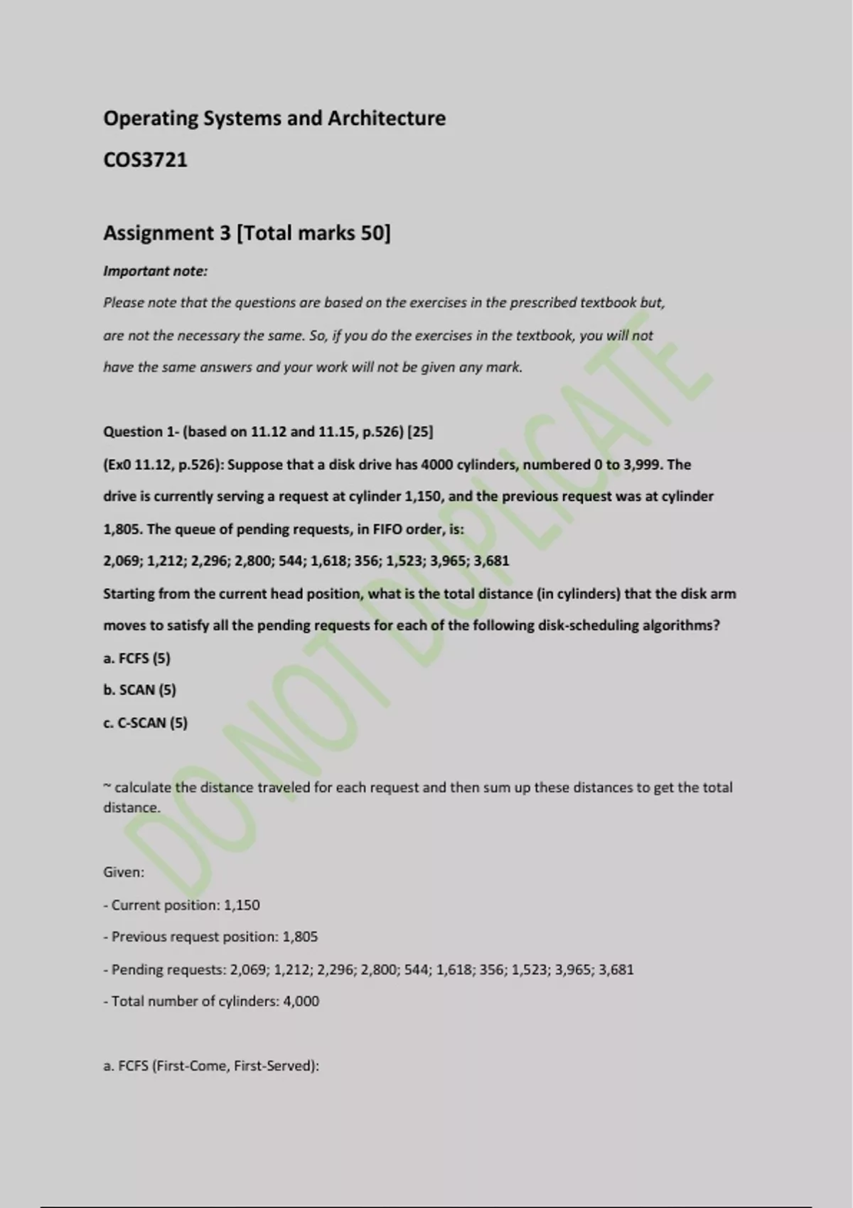 (Ex0 11.12, p.526): Suppose that a disk drive has 4000 cylinders, numbered 0 to 3,999. The
