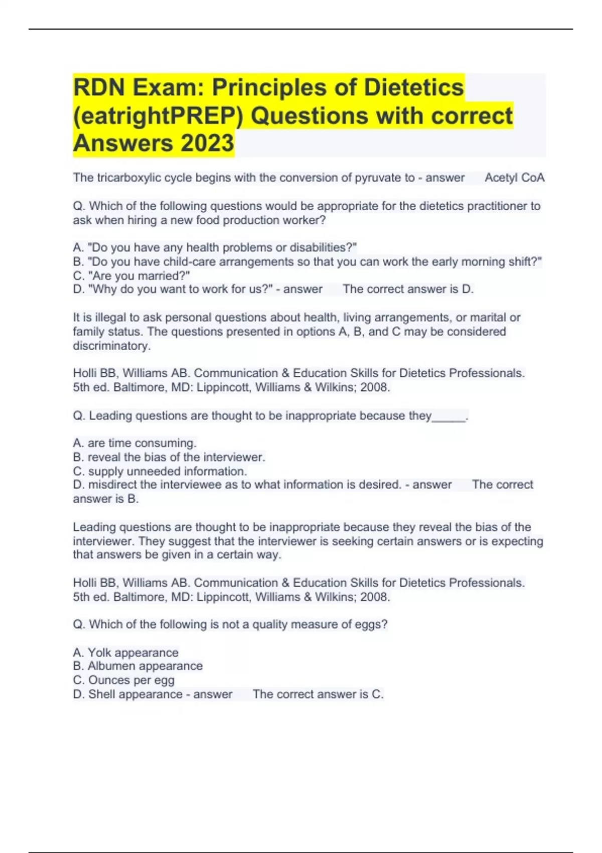 RDN Exam: Principles of Dietetics (eatrightPREP) Questions with correct Answers 2023 The tricarboxylic cycle begins with the conversion of pyruvate to Acetyl CoA Q. Which of the following questions would be appropriate for the dietetics practitioner to ask when hiring a new food production worker? A. "Do you have any health problems or disabilities?" B. "Do you have child-care arrangements so that you can work the early morning shift?" C. "Are you married?" D. "Why do you want to work for us?" The correct answer is D. It is illegal to ask personal questions about health, living arrangements, or marital or family status. The questions presented in options A, B, and C may be considered discriminatory. Holli BB, Williams AB. Communication & Education Skills for Dietetics Professionals. 5th ed. Baltimore, MD: Lippincott, Williams & Wilkins; 2008. Q. Leading questions are thought to be inappropriate because they_____. A. are time consuming. B. reveal the bias of the interviewer. C. supply unneeded information. D. misdirect the interviewee as to what information is desired. The correct answer is B. Leading questions are thought to be inappropriate because they reveal the bias of the interviewer. They suggest that the interviewer is seeking certain answers or is expecting that answers be given in a certain way. Holli BB, Williams AB. Communication & Education Skills for Dietetics Professionals. 5th ed. Baltimore, MD: Lippincott, Williams & Wilkins; 2008. Q. Which of the following is not a quality measure of eggs? A. Yolk appearance B. Albumen appearance C. Ounces per egg D. Shell appearance The correct answer is C. Interior egg quality is based on air cell size, albumen quality, yolk quality, and the presence of blood or meat spots. Shell quality is determined by stain, adhering dirt or foreign material, egg shape, shell texture, ridge, and shell thickness. Weight per egg is not a consideration. Food and Agriculture Organization of the United Nations. Egg Marketing. Chapter 2: Marketing Quality Eggs. Available at: Q. Which FDA class of recalls are for products that might cause a temporary health problem, or pose only a slight threat of a serious nature? Class I Class II Class III Class IV The correct answer is B. FDA class II recalls are for products that might cause a temporary health problem, or pose only a slight threat of a serious nature. (Class II USDA recalls involves a potential health hazard situation in which there is a remote probability of adverse health consequences from eating the food.) Cunningham E J. How is a food product recalled? J Am Diet Assoc. 2009; 109(8): 1488. Q. Which of the following phrases is the best example of how a dietetics practitioner should reiterate to the client information about his or her dietary intake of calcium? A. "The amount of calcium you eat is low." B. "Your dietary intake of calcium increases your risk for developing osteoporosis." C. "You eat one serving of a calcium-rich food each day and the experts tell us to eat three." D. "People who eat one serving of a calcium-rich food each day are at an increased risk for osteoporosis." The correct answer is D. Making a general response is less accusatory. This response shows that, in general, all individuals with limited calcium intake—not just the client—are at increased risk. Boyle MA, Holben DH. Community Nutrition in Action: An Entrepreneurial Approach. 5th ed. Belmont, CA: Wadsworth; 2009:544. Q. Medical anthropologists have developed Exploratory Models that address five major concerns about an illness episode. These models address: etiology, time and mode of onset of symptoms, course of sickness, treatment, and ___. A. exposure pattern. B. family history. C. pathophysiology. D. emotional response. The correct answer is C. Exploratory models also include pathophysiology that allows one to understand the changes associated with or resulting from diseases. Boyle MA, Holben DH. Community Nutrition in Action: An Entrepreneurial Approach. 6th ed. Boston, MA: Cengage; 2012. Q. The LEARN guidelines provide a framework that dietetics practitioners can use to convey a culturally sensitive treatment plan. The "A" in LEARN stands for _____. A. Acknowledge B. Assess C. Access D. Alternatives The correct answer is A. "Acknowledge" is represented by the "A" in the "LEARN" guidelines regarding culturally appropriate intervention strategy. The strategy allows practitioners to acknowledge and discuss differences and similarities during the treatment plan process. Boyle MA, Holben DH. Community Nutrition in Action: An Entrepreneurial Approach. 6th ed. Boston, MA: Cengage; 2012. Q. The Standards of Professional _____ for dietetics professionals describes in general terms a competent level of behavior in the professional role. A. Practice B. Performance C. Preparation D. Proficiency The correct answer is B. The Standards of Professional Performance describe competency levels of professional behavior by an individual. They specifically describe the performance of dietetics practitioners. The Academy Quality Management Committee and Scope of Practice Subcommittee of the Quality Management Committee. Academy of Nutrition and Dietetics Revised 2012 Standards of Practice and Standards of Professional Performance for Registered Dietitians. J Acad Nutr Diet. 2013;113(6):S29-S45. Q. Evidence-based medicine (EBM) involves grading evidence to support clinical guidelines and guide practice recommendations. Which of the following statements is valid regarding the Academy of Nutrition and Dietetics' system? A. Grade I indicates strong evidence to support a recommendation. B. Grade I indicates minimal evidence to support a recommendation. C. Grade I indicates expert opinion to support a recommendation. D. Grade I indicates fair evidence to support a recommendation. The correct answer is A. Grade I is the highest rating that is given for supporting evidence in research. It is indicated when there is strong supporting evidence f