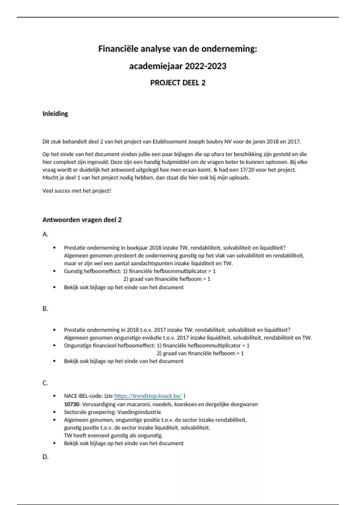 Dit stuk behandelt deel 2 van het project van Etablissement Joseph Soubry NV voor de jaren 2018 en 2017. Op het einde van het document vinden jullie een paar bijlagen die op ufora ter beschikking zijn gesteld en die hier compleet zijn ingevuld. Deze zijn een handig hulpmiddel om de vragen beter te kunnen oplossen. Bij elke vraag wordt er duidelijk het antwoord uitgelegd hoe men eraan komt. Ik had een 17/20 voor het project. Mocht je deel 1 van het project nodig hebben, dan staat die hier ook bij mijn uploads. Veel succes met het project!