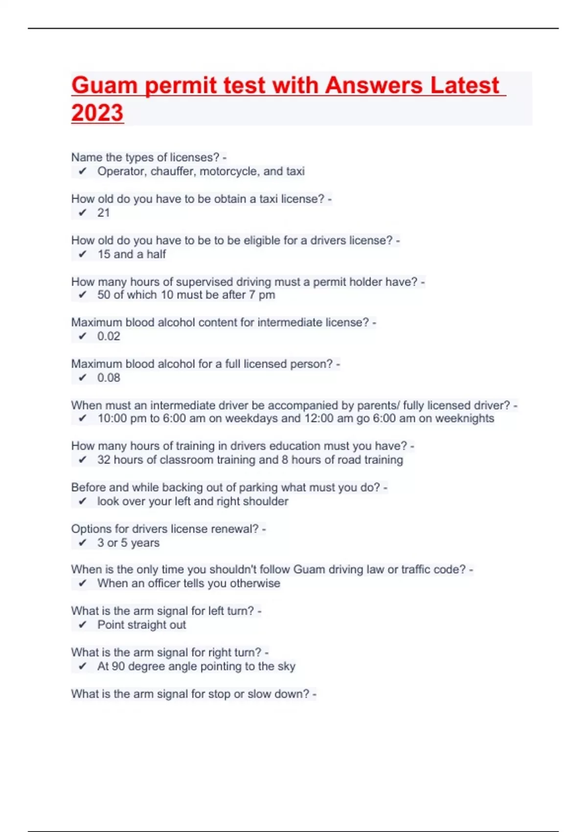 Name the types of licenses? - Operator, chauffer, motorcycle, and taxi How old do you have to be obtain a taxi license? - 21 How old do you have to be to be eligible for a drivers license? - 15 and a half How many hours of supervised driving must a permit holder have? - 50 of which 10 must be after 7 pm Maximum blood alcohol content for intermediate license? - 0.02 Maximum blood alcohol for a full licensed person? - 0.08 When must an intermediate driver be accompanied by parents/ fully licensed driver? - 10:00 pm to 6:00 am on weekdays and 12:00 am go 6:00 am on weeknights How many hours of training in drivers education must you have? - 32 hours of classroom training and 8 hours of road training Before and while backing out of parking what must you do? - look over your left and right shoulder Options for drivers license renewal? - 3 or 5 years