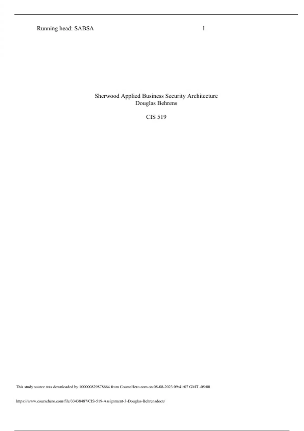 Running head: SABSA 1 Sherwood Applied Business Security Architecture Douglas Behrens CIS 519 Abstract Explains what SABSA is and how it works. This also explains what companies in the world that use the SABSA architecture. Sherwood Applied Business Security Architecture SABSA SABSA is a framework and it is also a methodology that can ensure that the right physical and information security controls that are required for executing a business strategy that applied to the right places and the right time with the appropriate cost levels. The SABSA was originally formed by John Sherwood in 1995 to help demonstrate that it could create a physical and technology architecture that meet swift interbank transfer system goals that provides $1 billion guarantees with every transfer would be secure when they are executed. SABSA is owned by and managed by the SABSA institute that is a registered ..........................................continued...............................................
