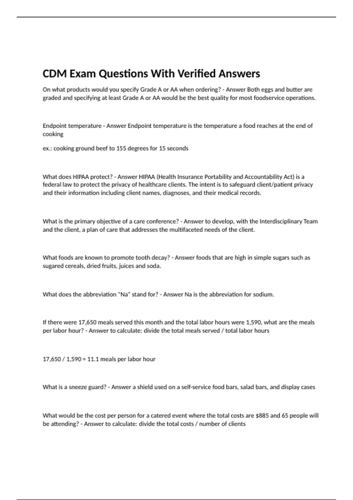 On what products would you specify Grade A or AA when ordering? - Answer Both eggs and butter are graded and specifying at least Grade A or AA would be the best quality for most foodservice operations. Endpoint temperature - Answer Endpoint temperature is the temperature a food reaches at the end of cooking ex.: cooking ground beef to 155 degrees for 15 seconds What does HIPAA protect? - Answer HIPAA (Health Insurance Portability and Accountability Act) is a federal law to protect the privacy of healthcare clients. The intent is to safeguard client/patient privacy and their information including client names, diagnoses, and their medical records. What is the primary objective of a care conference? - Answer to develop, with the Interdisciplinary Team and the client, a plan of care that addresses the multifaceted needs of the client. What foods are known to promote tooth decay? - Answer foods that are high in simple sugars such as sugared cereals, dried fruits, juices and soda. What does the abbreviation "Na" stand for? - Answer Na is the abbreviation for sodium. If there were 17,650 meals served this month and the total labor hours were 1,590, what are the meals per labor hour? - Answer to calculate: divide the total meals served / total labor hours 17,650 / 1,590 = 11.1 meals per labor hour What is a sneeze guard? - Answer a shield used on a self-service food bars, salad bars, and display cases What would be the cost per person for a catered event where the total costs are $885 and 65 people will be attending? - Answer to calculate: divide the total costs / number of clients $885 / 65 = $13.62 round up to $13.75 per person What is the purpose of a performance review? - Answer -ensures that the supervisor and employee communicate needs and the supervisor provides feedback -identifies need for improvement and growth -may serve as a formal basis for wage increases How many total calories would be in a food product with 12 grams of carbs, 3 grams of fat, 2 grams of protein? - Answer - Carbs: 12 x 4 = 48 -Fat 3 x9 = 27 -Protein 2 x4 = 8 Total = 83 what federal law protects the privacy of healthcare clients? - Answer HIPAA - Health Insurance Portability and Accountability Act Identify the current government food guidance system used in the United States - Answer -MyPlate -Dietary Guidelines for Americans Assistive Devices - Answer devices that will assist clients in eating what are the most common food allergies in the U.S.? - Answer 1. Peanuts 2. Tree Nuts 3. Shellfish 4. Fish 5. Egg 6. Milk 7. Soy 8. Wheat What is the daily protein allowance? - Answer 0.8 grams/kg of body weight ex. 156 - 70.90 kg x 0.8 = 56.73 or 57 grams of protein what cooking procedures destroy vitamins? - Answer 1. cooking for too long 2. cooking at too high a temperature 3. adding baking soda during cooking what kind of eggs have been recommended for use by USDA and FDA? - Answer Pasteurized eggs (heats eggs in the shell and destroys bacteria and salmonella contamination) what two treatments must be present in a dairy product that doesn't require refrigeration? - Answer -UHT - ultra-high temperature pasteurization -Aseptic (sterile) what would be included in a product standard for cooked pasta? - Answer pasta should hold its shape and not be too soft or mushy what tool is used for tracking amounts of food served and leftovers? - Answer Tally sheet what is the purpose of a food requisition? - Answer -used to sign food out of storage areas -serves as a record for what is taken out of storage and is useful in cost control and inventory management