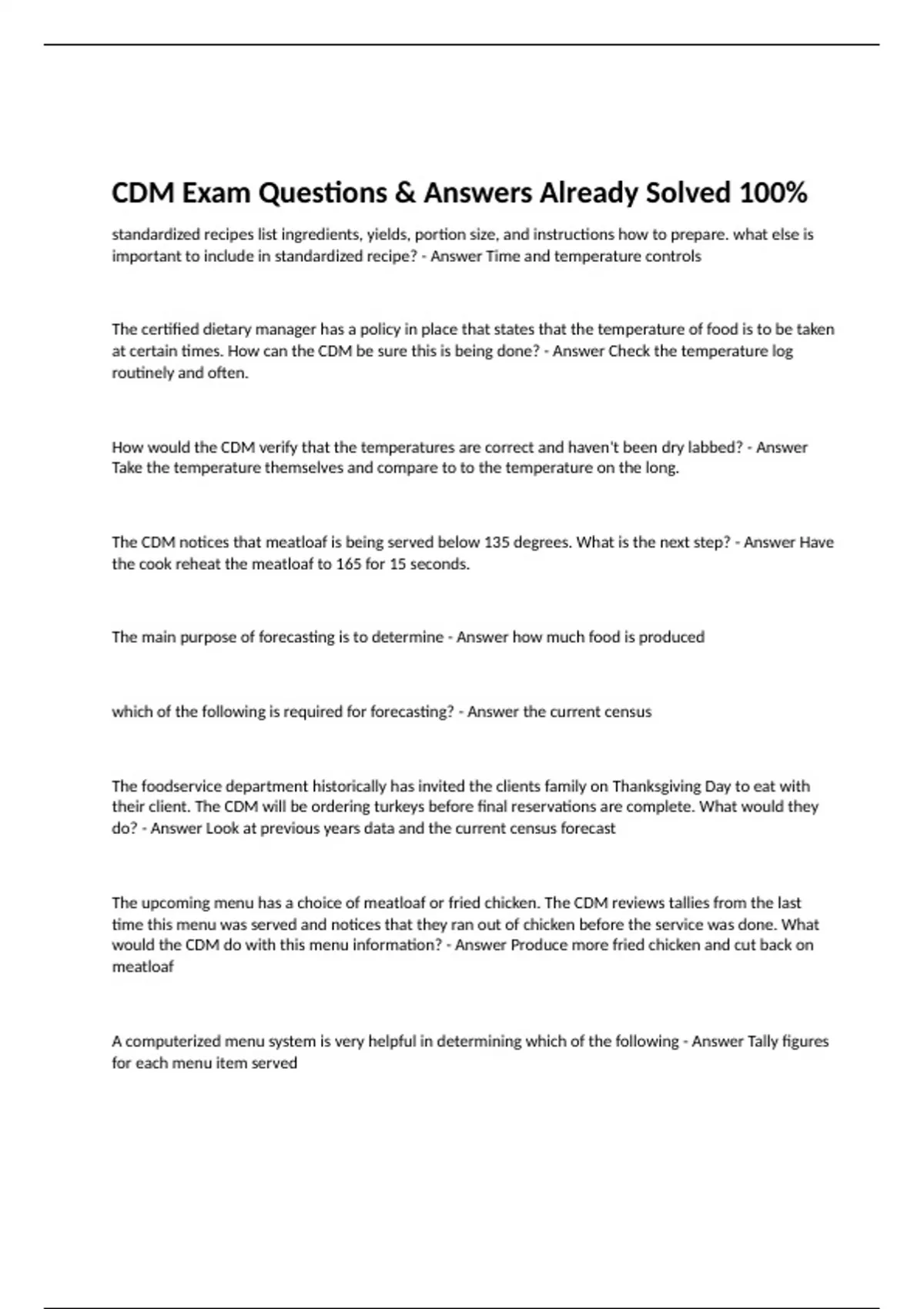 standardized recipes list ingredients, yields, portion size, and instructions how to prepare. what else is important to include in standardized recipe? - Answer Time and temperature controls The certified dietary manager has a policy in place that states that the temperature of food is to be taken at certain times. How can the CDM be sure this is being done? - Answer Check the temperature log routinely and often. How would the CDM verify that the temperatures are correct and haven't been dry labbed? - Answer Take the temperature themselves and compare to to the temperature on the long. The CDM notices that meatloaf is being served below 135 degrees. What is the next step? - Answer Have the cook reheat the meatloaf to 165 for 15 seconds. The main purpose of forecasting is to determine - Answer how much food is produced which of the following is required for forecasting? - Answer the current census The foodservice department historically has invited the clients family on Thanksgiving Day to eat with their client. The CDM will be ordering turkeys before final reservations are complete. What would they do? - Answer Look at previous years data and the current census forecast The upcoming menu has a choice of meatloaf or fried chicken. The CDM reviews tallies from the last time this menu was served and notices that they ran out of chicken before the service was done. What would the CDM do with this menu information? - Answer Produce more fried chicken and cut back on meatloaf A computerized menu system is very helpful in determining which of the following - Answer Tally figures for each menu item served
