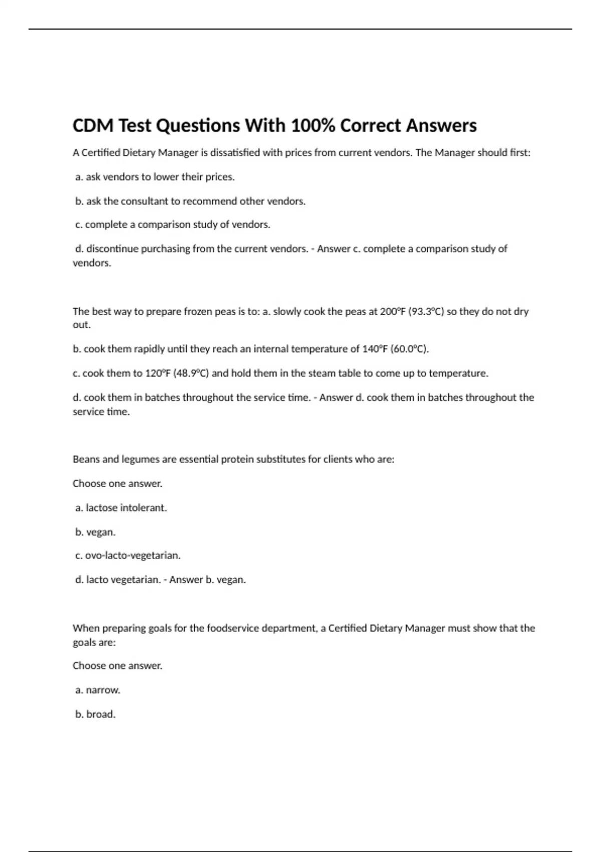 A Certified Dietary Manager is dissatisfied with prices from current vendors. The Manager should first: a. ask vendors to lower their prices. b. ask the consultant to recommend other vendors. c. complete a comparison study of vendors. d. discontinue purchasing from the current vendors. - Answer c. complete a comparison study of vendors. The best way to prepare frozen peas is to: a. slowly cook the peas at 200°F (93.3°C) so they do not dry out. b. cook them rapidly until they reach an internal temperature of 140°F (60.0°C). c. cook them to 120°F (48.9°C) and hold them in the steam table to come up to temperature. d. cook them in batches throughout the service time. - Answer d. cook them in batches throughout the service time. Beans and legumes are essential protein substitutes for clients who are: Choose one answer. a. lactose intolerant. b. vegan. c. ovo-lacto-vegetarian. d. lacto vegetarian. - Answer b. vegan. When preparing goals for the foodservice department, a Certified Dietary Manager must show that the goals are: Choose one answer. a. narrow. b. broad. c. listed on the bulletin board. d. transferrable to other departments. - Answer b. broad. When purchasing food, a Certified Dietary Manager must develop specifications to ensure that: Choose one answer. a. government commodities are used when available. b. eggs are delivered in a timely manner. c. milk arrives at a temperature below 41°F (5°C). d. canned fruits are packed in water or juice. - Answer c. milk arrives at a temperature below 41°F (5°C). When a client has trouble swallowing pureed foods, the Certified Dietary Manager should: Choose one answer. a. request a swallowing evaluation. b. thin foods to straw consistency. c. inform the physician at the next care plan meeting. d. thicken foods to the next consistency level. - Answer a. request a swallowing evaluation. A calorie count must include: Choose one answer. a. all condiments and beverages served. b. portion sizes of items before consumption. c. initials of the employee documenting the intake. d. how long it took for t - Answer a. all condiments and beverages served. When selecting diabetes educational information for a client in a long-term care facility, a Certified Dietary Manager should consider using materials: Choose one answer. a. written in the English language. b. with technical language to explain the details of the disease. c. in a pocketbook format with small print so it can be kept with the client. d. with simple and relevant illustrations. - Answer d. with simple and relevant illustrations. Which of the following items should NOT be served to a client who is lactose intolerant? Choose one answer. a. Dinner roll b. Buttered carrots c. Chocolate pudding d. Glazed ham - Answer c. Chocolate pudding To effectively prevent foodborne illnesses, the Certified Dietary Manager should most appropriately: Choose one answer. a. remove potentially dangerous food items from the menu. b. provide employees with weekly in-service training. c. monitor time and temperature controls. d. cook all hot foods to an internal temperature of 180°F (82.2°C). - Answer c. monitor time and temperature controls. A Certified Dietary Manager is interviewing a client who recently had a stroke. The client reports painful swallowing, food sticking in her throat, and coughing during meals. The Manager should recognize that these symptoms are indicative of: Choose one answer. a. hiatal hernia. b. gastroesophageal reflux disease (GERD). c. gastritis. d. dysphagia. - Answer d. dysphagia. Two important steps in standardizing a new recipe are: Choose one answer. a. taking a picture and marketing the new menu item. b. testing and garnishing. c. testing and modifying. d. taking a picture and writing directions. - Answer c. testing and modifying. When preparing a standardized recipe, the Certified Dietary Manager needs to increase the yield from 12 servings to 80 servings. What is the yield or conversion factor? Choose one answer. a. .15 b. 6.67 c. 15 d. 12.8 - Answer b. 6.67 A Certified Dietary Manager can best monitor cash register receipts by: Choose one answer. a. thoroughly training cashiers. b. randomly using different registers. c. completing a daily report form. d. rotating cashiers among registers. - Answer c. completing a daily report form. When planning an equipment maintenance schedule, the Certified Dietary Manager should: Choose one answer. a. define a cleaning schedule and assign tasks to employees. b. have employees report any problems or issues to management. c. keep equipment maintenance manuals locked away when not in use. d. hire a cleaning crew and inspect their work. - Answer a. define a cleaning schedule and assign tasks to employees. Which of the following statements about the par level of inventory management is true? Choose one answer. a. New stock items are rarely purchased. b. A physical inventory is conducted regularly. c. It uses a running balance of products on hand. d. It does not require lead time. - Answer b. A physical inventory is conducted regularly. A good way to increase efficiency among staff for job coverage is to: Choose one answer. a. promote a job routine. b. allow flextime. c. hire part-time staff. d. implement cross-training. - Answer d. implement cross-training. To prevent E. coli, a Certified Dietary Manager should ensure that ground beef is cooked to a mimimum temperature of: Choose one answer. a. 155°F (68.3°C) for 15 seconds. b. 175°F (79.4°C) for 15 seconds. c. 140°F (60.0°C) for 15 seconds. d. 180°F (82.2°C) for 15 seconds. - Answer a. 155°F (68.3°C) for 15 seconds How should a Certified Dietary Manager resolve a conflict between two cooks? Choose one answer. a. Ask human resources to act as a mediator. b. Permanently assign them to different shifts. c. Help them work through their differences. d. Ask them to work things out on their own - Answer c. Help them work through their differences. What part of the nutrition care process