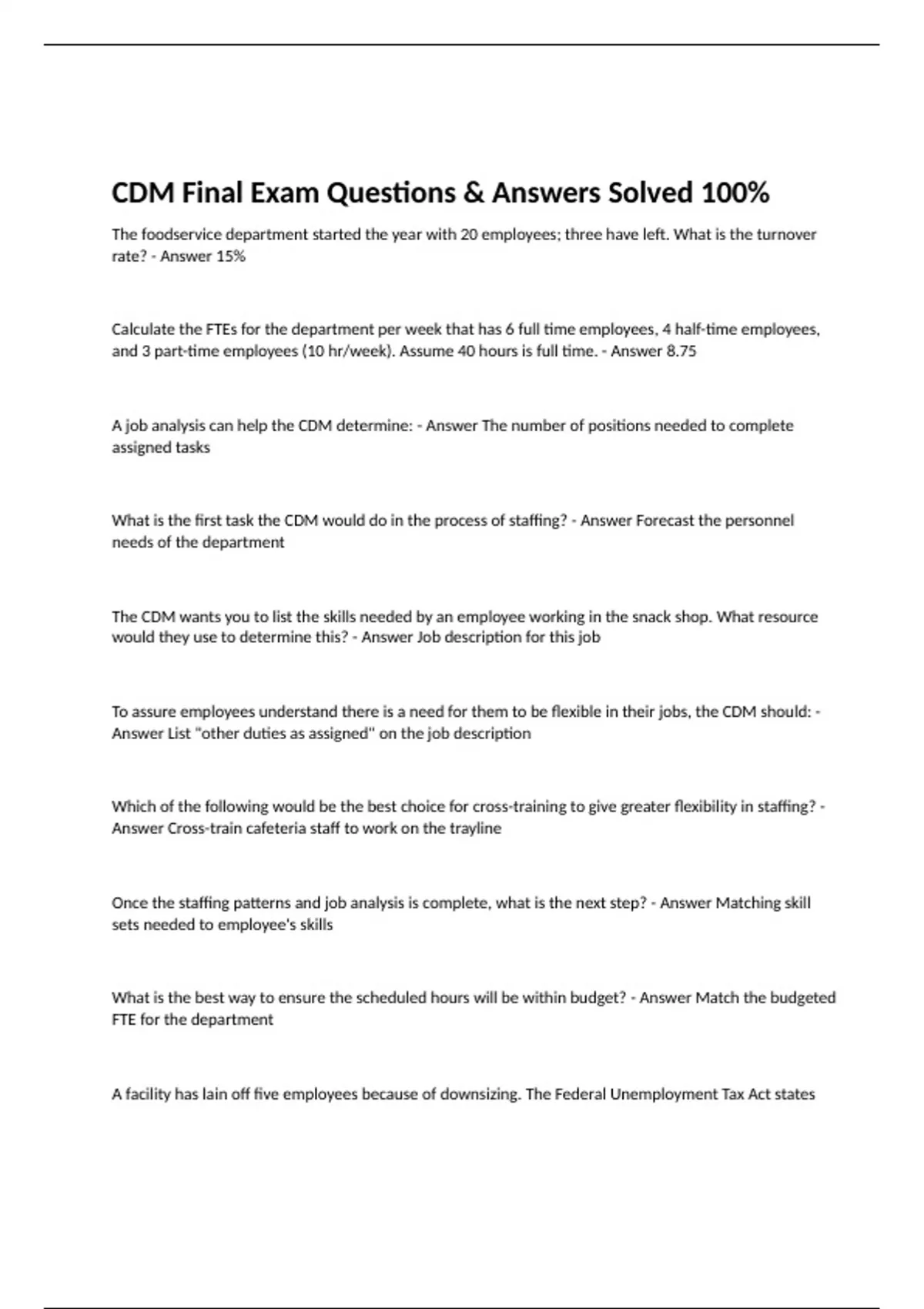 The foodservice department started the year with 20 employees; three have left. What is the turnover rate? - Answer 15% Calculate the FTEs for the department per week that has 6 full time employees, 4 half-time employees, and 3 part-time employees (10 hr/week). Assume 40 hours is full time. - Answer 8.75 A job analysis can help the CDM determine: - Answer The number of positions needed to complete assigned tasks What is the first task the CDM would do in the process of staffing? - Answer Forecast the personnel needs of the department The CDM wants you to list the skills needed by an employee working in the snack shop. What resource would they use to determine this? - Answer Job description for this job To assure employees understand there is a need for them to be flexible in their jobs, the CDM should: - Answer List "other duties as assigned" on the job description Which of the following would be the best choice for cross-training to give greater flexibility in staffing? - Answer Cross-train cafeteria staff to work on the trayline Once the staffing patterns and job analysis is complete, what is the next step? - Answer Matching skill sets needed to employee's skills What is the best way to ensure the scheduled hours will be within budget? - Answer Match the budgeted FTE for the department A facility has lain off five employees because of downsizing. The Federal Unemployment Tax Act states that: - Answer The employees will receive unemployment checks and part of the funds will come from the facility's routine unemployment tax Can the CDM specify that the receiving clerk has certain physical abilities? - Answer Yes, these abilities are essential to performing the work Which question may the CDM ask during the interview process? - Answer Have you ever been convicted of a felony? The regulations of the Equal Employment Opportunity Commission govern facilities that employ how many staff? - Answer 15 or more The 1967 Age Discrimination in Employment Act protects employees who are: - Answer 40 or older A facility policy on sexual harassment should include which of the following? - Answer The formal complaint procedure for the employee The requirement to provide overtime pay comes from: - Answer The Fair Labor Standards Act The Americans with Disabilities Act allows asking an applicant to have a medical exam: - Answer After the employment has been offered When you are doing reference checks, it is important to: - Answer Use a standard form to ask for dates of employment and reason for leaving What is the greatest advantage of following the checklist during the orientation of a new employee? - Answer A checklist will assure that all areas in the orientation are covered The first step in planning training is: - Answer Determine the need for training The CDM has been asked to help present an all staff inservice about HIPAA. What would be the best way to present that training? - Answer Develop the inservice as a series of roll plating following the HIPAA regulation While inventorying the cooler, the CDM notices raw chicken stored above roast beef. What should the CDM do first? - Answer Use the opportunity to immediately train employees about the correct way to store raw meat It is important that the CDM provide annual training and as needed on which subject? - Answer Sanitation and safety An easy way for foodservice staff to receive training is: - Answer Use web-based training programs during slack times What is the best source of information on sanitation and safety to use in training? - Answer State and local health departments After a demonstration, an employee should: - Answer Practice with coaching and feedback What does the term cross-training mean? - Answer Employees are trained to proficient on more than one job When would adjustments have to be made to add more staffing hours? - Answer If the census in the facility increases above normal One FTE is equal to how many hours for one year? - Answer 2080 A shift schedule allows: - Answer The beginning and ending times for all positions necessary to put meals out What is the advantage of creating a split shift? - Answer Hours can be scheduled when they are needed