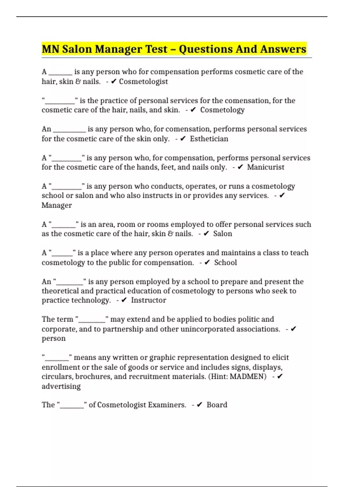 mn salon manager test – questions and answers
