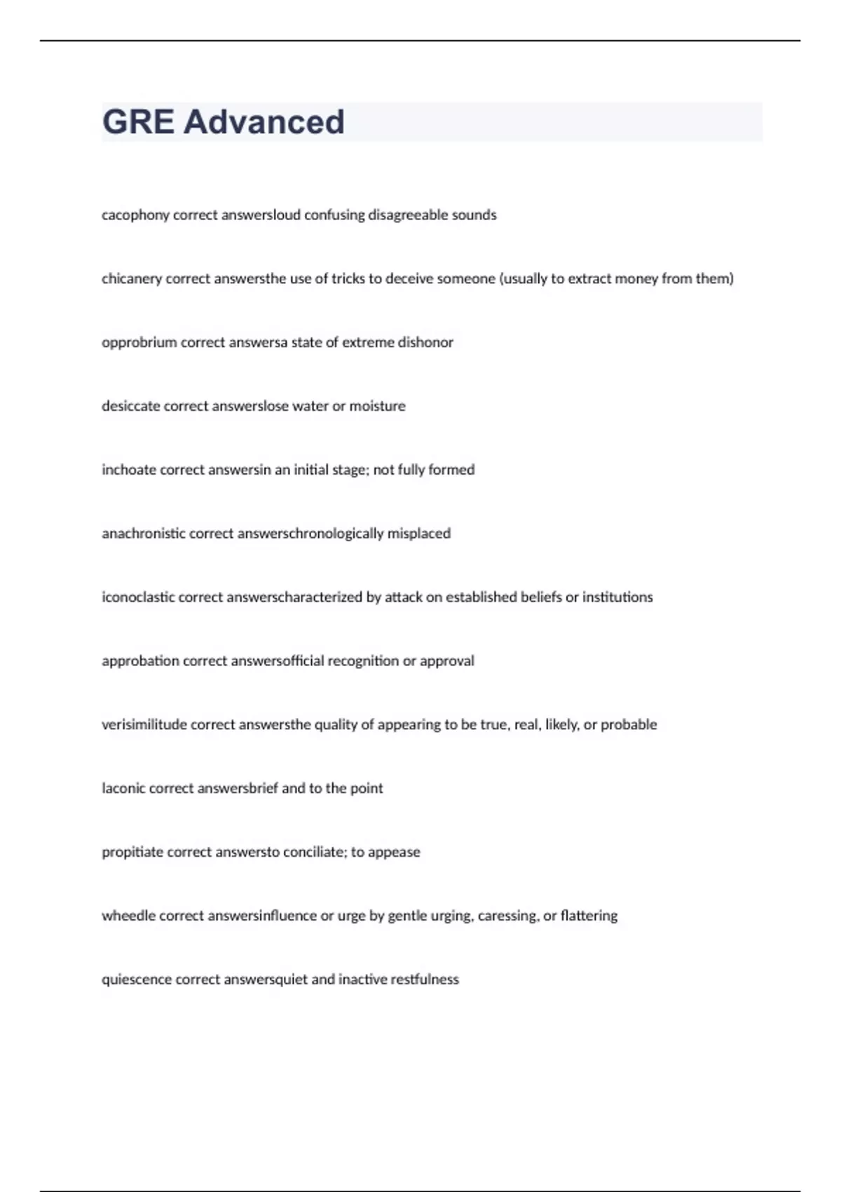 cacophony correct answersloud confusing disagreeable sounds chicanery correct answersthe use of tricks to deceive someone (usually to extract money from them) opprobrium correct answersa state of extreme dishonor desiccate correct answerslose water or moisture inchoate correct answersin an initial stage; not fully formed anachronistic correct answerschronologically misplaced iconoclastic correct answerscharacterized by attack on established beliefs or institutions approbation correct answersofficial recognition or approval