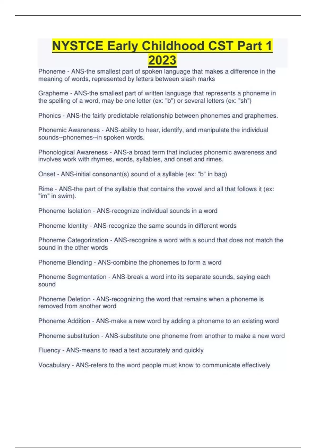 NYSTCE Early Childhood CST Part 1 2023 Phoneme - ANS-the smallest part of spoken language that makes a difference in the meaning of words, represented by letters between slash marks Grapheme - ANS-the smallest part of written language that represents a phoneme in the spelling of a word, may be one letter (ex: "b") or several letters (ex: "sh") Phonics - ANS-the fairly predictable relationship between phonemes and graphemes. Phonemic Awareness - ANS-ability to hear, identify, and manipulate the individual sounds--phonemes--in spoken words. Phonological Awareness - ANS-a broad term that includes phonemic awareness and involves work with rhymes, words, syllables, and onset and rimes. Onset - ANS-initial consonant(s) sound of a syllable (ex: "b" in bag) Rime - ANS-the part of the syllable that contains the vowel and all that follows it (ex: "im" in swim). Phoneme Isolation - ANS-recognize individual sounds in a word Phoneme Identity - ANS-recognize the same sounds in different words Phoneme Categorization - ANS-recognize a word with a sound that does not match the sound in the other words Phoneme Blending - ANS-combine the phonemes to form a word Phoneme Segmentation - ANS-break a word into its separate sounds, saying each sound Phoneme Deletion - ANS-recognizing the word that remains when a phoneme is removed from another word Phoneme Addition - ANS-make a new word by adding a phoneme to an existing word Phoneme substitution - ANS-substitute one phoneme from another to make a new word Fluency - ANS-means to read a text accurately and quickly Vocabulary - Continues...