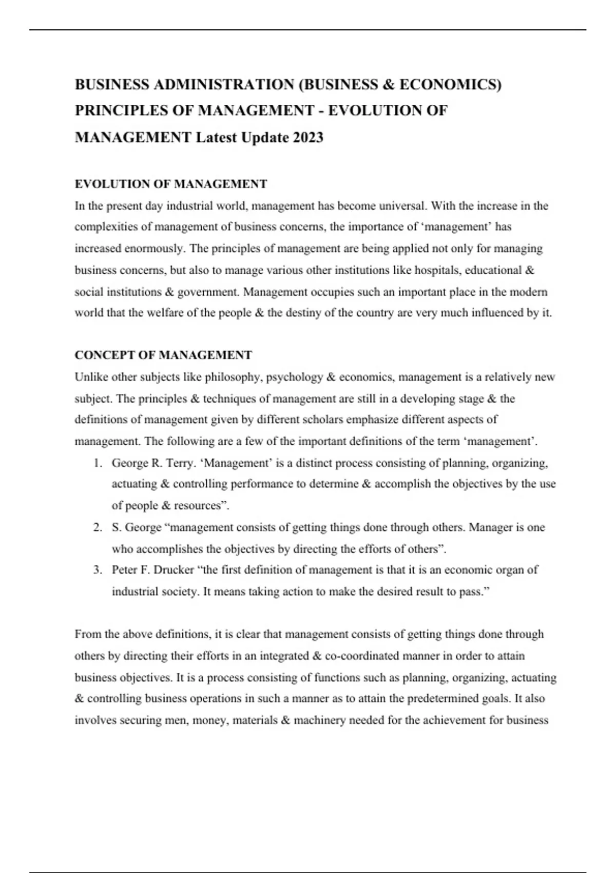 BUSINESS ADMINISTRATION (BUSINESS & ECONOMICS) PRINCIPLES OF MANAGEMENT - EVOLUTION OF MANAGEMENT Latest Update 2023