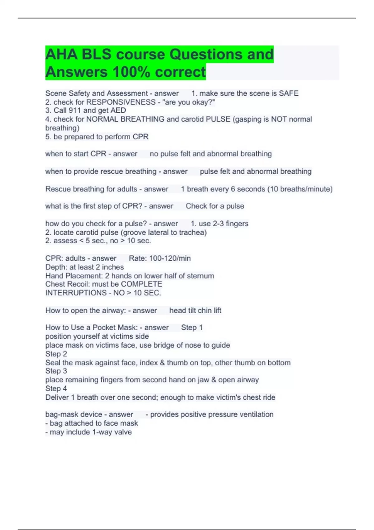 AHA BLS course Questions and Answers 100% correct