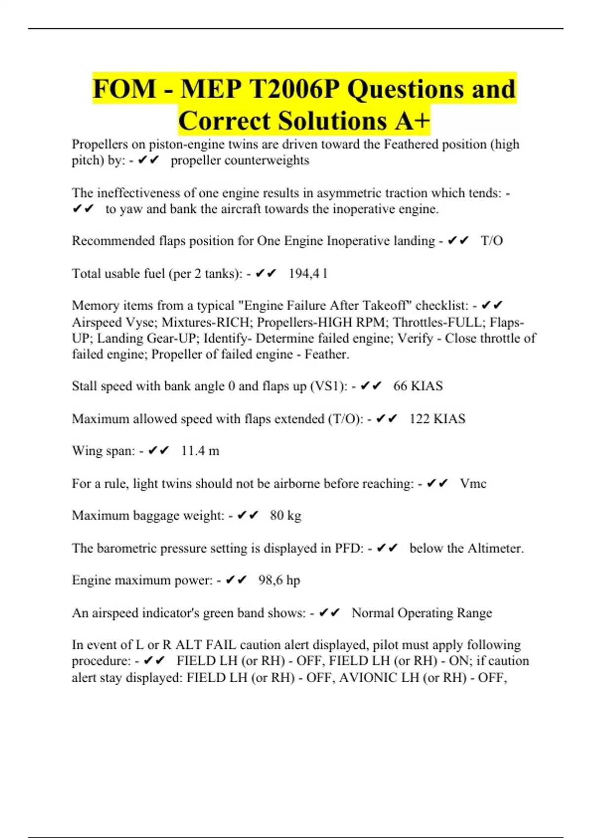 Propellers on piston-engine twins are driven toward the Feathered position (high pitch) by: - propeller counterweights The ineffectiveness of one engine results in asymmetric traction which tends: - to yaw and bank the aircraft towards the inoperative engine. Recommended flaps position for One Engine Inoperative landing - T/O Total usable fuel (per 2 tanks): - 194,4 l Memory items from a typical "Engine Failure After Takeoff" checklist: - Airspeed Vyse; Mixtures-RICH; Propellers-HIGH RPM; Throttles-FULL; Flaps-UP; Landing Gear-UP; Identify- Determine failed engine; Verify - Close throttle of failed engine; Propeller of failed engine - Feather. Stall speed with bank angle 0 and flaps up (VS1): - 66 KIAS Maximum allowed speed with flaps extended (T/O): - 122 KIAS Wing span: - 11.4 m For a rule, light twins should not be airborne before reaching: - Vmc Maximum baggage weight: - 80 kg The barometric pressure setting is displayed in PFD: - below the Altimeter. Engine maximum power: - 98,6 hp An airspeed indicator's green band shows: - Normal Operating Range In event of L or R ALT FAIL caution alert displayed, pilot must apply following procedure: - FIELD LH (or RH) - OFF, FIELD LH (or RH) - ON; if caution alert stay displayed: FIELD LH (or RH) - OFF, AVIONIC LH (or RH) - OFF, ADF - OFF, limit the landing light use; if caution alert stay displayed: CROSS BUS LH (or RH) - OFF Electrical system type is: - 12 V, DC The basic OEI emergency procedures common to all conventional light twins: - Control.Configure. Climb. Checklist Propeller type: - variable pitch (constant speed) Minimum oil pressure (RPM1400): - 0,8 bar In case of single generator failure the battery and another generator are able to supply electrical power necessary for: - the entire mission, but redundancy is lost. Aircraft Minimum control speed (VMC) with one engine inoperative: - 62 KIAS Recommended safe simulated OEI speed (Vsse) - 70 KIAS Who is responsible for checking the weight and CG excursion are compliant with the related limits: - Pilot Emergency gear extension access door location is: - on pilots left side floor. Minimum oil temperature (C°): - 50° Never exceed speed in any operation (VNE): - 171 KIAS For an airplane CG position calculation the Datum is: - The wing leading edge vertical After lift-of Vy should be maintained until: - a safe single engine maneuvering altitude, typically at least 400 feet AGL, has been achieved. The MFD normally displays - a full-color moving map with navigation information, while the left portion of the MFD is dedicated to the Navigation information Display. Propeller: - number of blades - 2, made of wood/composite An airspeed indicator's white band's upper limit shows: - Maximum speed with flaps FULL Engine securing in flight procedure: - Throttle - IDLE; Ignition - both OFF; Propeller - FEATHER; Fuel Selector - OFF; Electrical Fuel Pump - OFF In case of both generators failure the battery supply electrical power for at least: - 30 min.