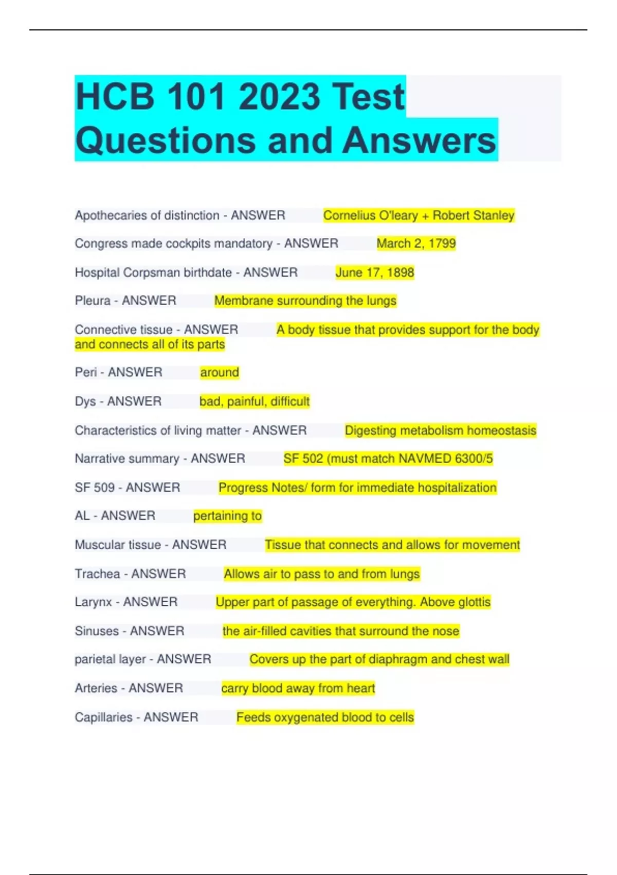 HCB 101 2023 Test Questions and Answers Apothecaries of distinction - ANSWER Cornelius O'leary + Robert Stanley Congress made cockpits mandatory - ANSWER March 2, 1799 Hospital Corpsman birthdate - ANSWER June 17, 1898 Pleura - ANSWER Membrane surrounding the lungs Connective tissue - ANSWER A body tissue that provides support for the body and connects all of its parts Peri - ANSWER around Dys - ANSWER bad, painful, difficult Characteristics of living matter - ANSWER Digesting metabolism homeostasis Narrative summary - ANSWER SF 502 (must match NAVMED 6300/5