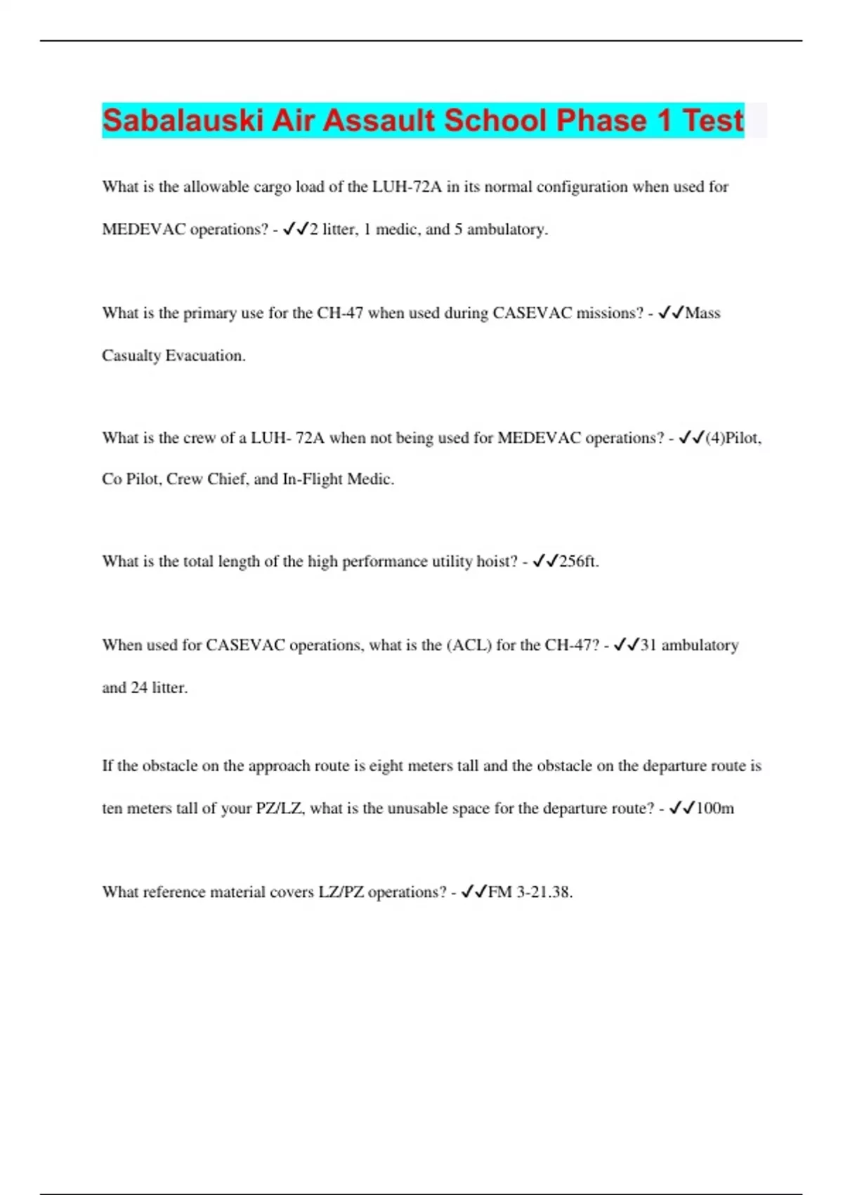Sabalauski Air Assault School Phase 1 Test | 2023 | Questions with 100% Correct Answers | Updated & Verified