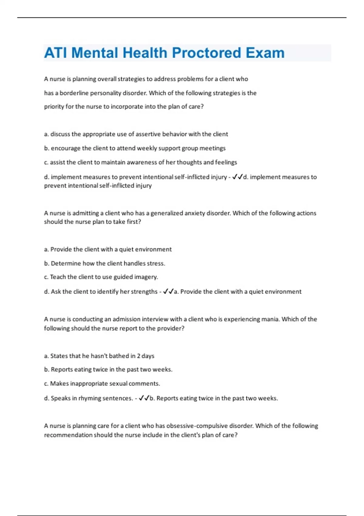 A nurse is planning overall strategies to address problems for a client who has a borderline personality disorder. Which of the following strategies is the priority for the nurse to incorporate into the plan of care? a. discuss the appropriate use of assertive behavior with the client b. encourage the client to attend weekly support group meetings c. assist the client to maintain awareness of her thoughts and feelings d. implement measures to prevent intentional self-inflicted injury - d. implement measures to prevent intentional self-inflicted injury A nurse is admitting a client who has a generalized anxiety disorder. Which of the following actions should the nurse plan to take first? a. Provide the client with a quiet environment b. Determine how the client handles stress. c. Teach the client to use guided imagery. d. Ask the client to identify her strengths - a. Provide the client with a quiet environment A nurse is conducting an admission interview with a client who is experiencing mania. Which of the following should the nurse report to the provider? a. States that he hasn't bathed in 2 days b. Reports eating twice in the past two weeks. c. Makes inappropriate sexual comments. d. Speaks in rhyming sentences. - b. Reports eating twice in the past two weeks. A nurse is planning care for a client who has obsessive-compulsive disorder. Which of the following recommendation should the nurse include in the client's plan of care?a. Validation therapy b. Thought stopping c. Operant conditioning d. Reality orientation therapy - b. Thought stopping