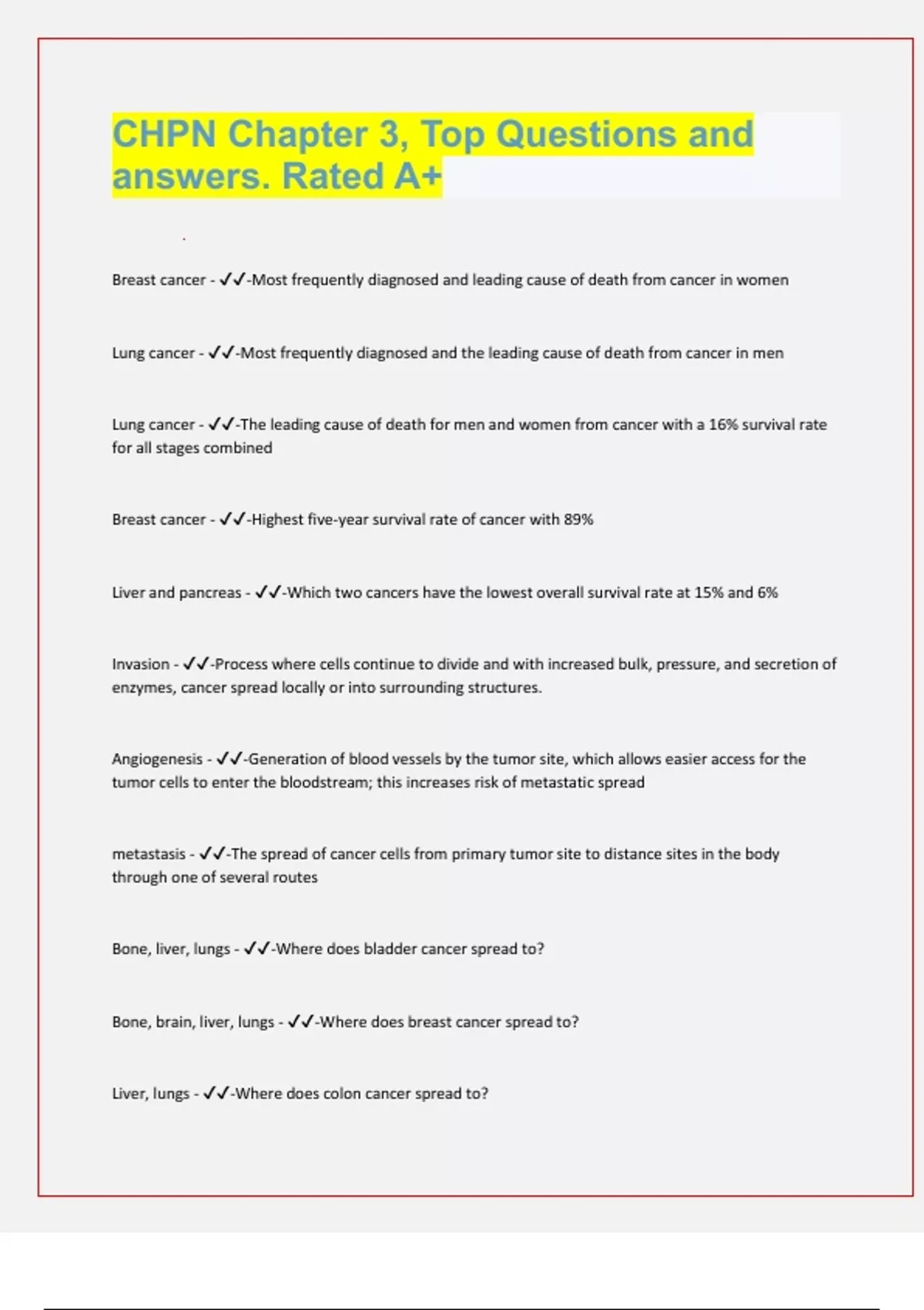 CHPN Chapter 3, Top Questions and answers. Rated A+ Breast cancer - -Most frequently diagnosed and leading cause of death from cancer in women Lung cancer - -Most frequently diagnosed and the leading cause of death from cancer in men Lung cancer - -The leading cause of death for men and women from cancer with a 16% survival rate for all stages combined Breast cancer - -Highest five-year survival rate of cancer with 89% Liver and pancreas - -Which two cancers have the lowest overall survival rate at 15% and 6% Invasion - -Process where cells continue to divide and with increased bulk, pressure, and secretion of enzymes, cancer spread locally or into surrounding structures. Angiogenesis - -Generation of blood vessels by the tumor site, which allows easier access for the tumor cells to enter the bloodstream; this increases risk of metastatic spread metastasis - -The spread of cancer cells from primary tumor site to distance sites in the body through one of several routes Bone, liver, lungs - -Where does bladder cancer spread to? Bone, brain, liver, lungs - -Where does breast cancer spread to? Liver, lungs - -Where does colon cancer spread to? Adrenal gland, bone, brain, liver, other lung - -Where does lung cancer spread to? Adrenal gland, bone, liver, lungs - -Where does prostate cancer spread to? Curative - -Type of cancer treatment- the intention of the treatment is elimination of the tumor and cure of the patient from cancer Adjuvent - -Types of cancer treatment - a type of treatment that is used in addition to her after the primary therapy in order to aid in the principal treatment regimen and to lower the risk of cancer returning ex. radiation after surgical resection. Neoadjuvent - -Types of cancer treatment- treatment given before the primary therapy such as chemo therapy prior to surgical resection Palliative - -Types of cancer treatment - a treatment that is intended to relieve or alleviate the symptoms or burden of the cancer and improve quality of life; not intended to cure. Teletherapy - -Delivery of radiation therapy from an External source Brachytherapy - -Radioactive source is placed inside of or directly on the body. Skin reaction, fatigue, weight loss, Myelosuppression, alone is, nausea and vomiting, mucositis, xerostomia - -Side effects of radiation Stomatitis, alopecia , myelosuppression, nausea with or without vomiting, diarrhea, fatigue - -Side effects of chemotherapy Cardiotoxicity - -Toxicity to the cardiac system induced by chemotherapy is similar in presentation to congestive heart failure with dyspnea, cough, pedal edema, poor response to diuretics or digitalis. Most common with anthrcyclines Neurotoxicity - -This causes chemotherapy associated Peripheral neuropathy and presentation starts where patient feels like they're wearing socks or gloves, also with distribution with report of burning, tingling, numbness, or vibration sensations. Pulomomary toxicity - -This side effect of chemotherapy is typically irreversible and progressive. It presented as a drug-induced pneumonitis or restrictive lung disease with dyspnea, Non-productive cough, basil or rails, tachypnea, and low-grade fever. Most common cause it to have agent is Bleomycin. Nephrotoxicity - -A dose limiting toxicity for some chemo therapy's, depending on severity of damage. Cisplatin is known for this and can occur 3 to 21 hours after dose given and can persist for several years and may be irreversible. Hepatotoxicity - -presentation of the side effect of chemotherapy includes elevated enzymes and can progress to jaundiced, hepato-megaly, and encephalopathy, and abdominal pain. Decline in functional status, PPS - -The most important prognostic indicator Younger women have a poor prognosis related to hormonal shifts and obviously shouldn't cycles - -Breast cancer prognosis statistics Pancreatic Cancer - -Type of cancer were less than 24% of patients survive longer than one year and five-year survival rate is 6%. Most common presentation includes weight loss and wasting. This is the fifth most common cause of cancer death in the US Colon Cancer - -The third leading cause of cancer death and men and women; five-year survival of those with distance spread is less than 10%. Symptoms include anemia, fatigue, partial or complete obstruction, pain, blood in the stool, fistula. Stomach cancer - -Significantly higher incident in males, caucasian to African-Americans it's a 2 to 1 ratio, overall incident has declined in the United States over the past 35 years. This is the third most common cause of cancer deaths globally.