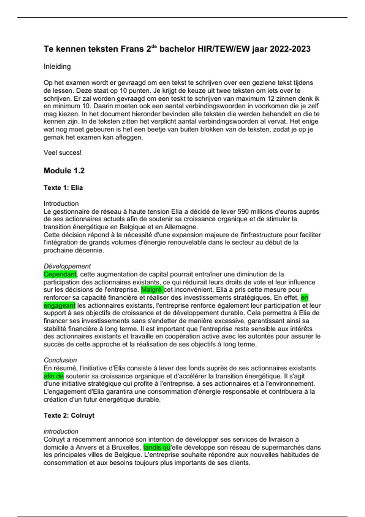 Te kennen teksten Frans 2de bachelor HIR/TEW/EW jaar 2022-2023