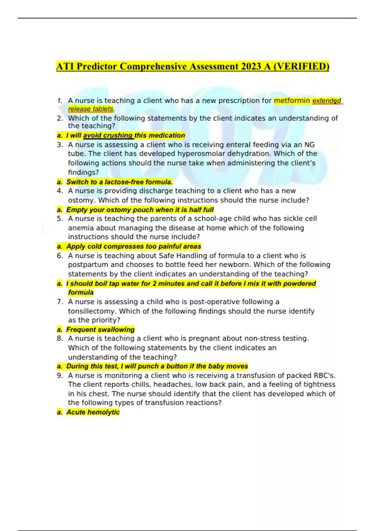 ATI Predictor Comprehensive Assessment 2023 A (VERIFIED) 1. A nurse is teaching a client who has a new prescription for metformin extended release tablets. 2. Which of the following statements by the client indicates an understanding of the teaching? a. I will avoid crushing this medication 3. A nurse is assessing a client who is receiving enteral feeding via an NG tube. The client has developed hyperosmolar dehydration. Which of the following actions should the nurse take when administering the client’s findings? a. Switch to a lactose-free formula. 4. A nurse is providing discharge teaching to a client who has a new ostomy. Which of the following instructions should the nurse include? a. Empty your ostomy pouch when it is half full 5. A nurse is teaching the parents of a school-age child who has sickle cell anemia about managing the disease at home which of the following instructions should the nurse include? a. Apply cold compresses too painful areas 6. A nurse is teaching about Safe Handling of formula to a client who is postpartum and chooses to bottle feed her newborn. Which of the following statements by the client indicates an understanding of the teaching? a. I should boil tap water for 2 minutes and call it before I mix it with powdered formula 7. A nurse is assessing a child who is post-operative following a tonsillectomy. Which of the following findings should the nurse identify as the priority? a. Frequent swallowing
