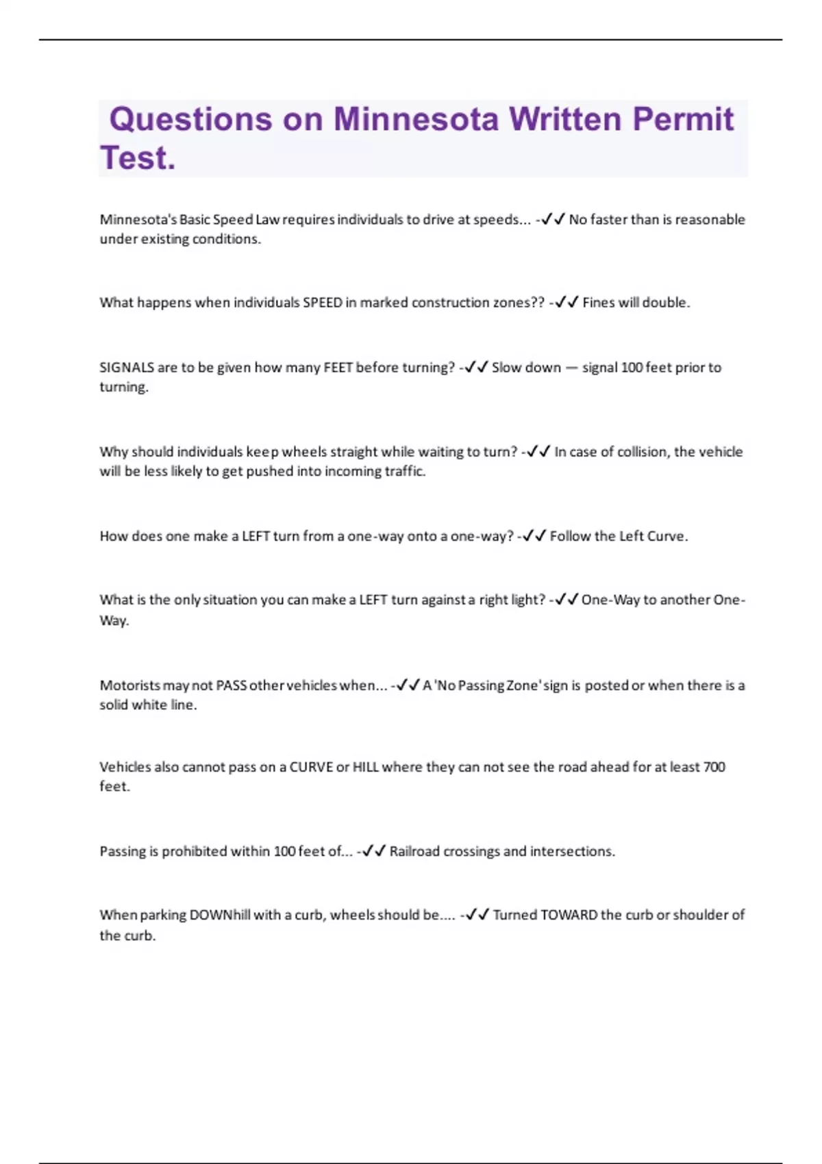Minnesota's Basic Speed Law requires individuals to drive at speeds... - No faster than is reasonable under existing conditions. What happens when individuals SPEED in marked construction zones?? - Fines will double. SIGNALS are to be given how many FEET before turning? - Slow down — signal 100 feet prior to turning. Why should individuals keep wheels straight while waiting to turn? - In case of collision, the vehicle will be less likely to get pushed into incoming traffic. How does one make a LEFT turn from a one-way onto a one-way? - Follow the Left Curve. What is the only situation you can make a LEFT turn against a right light? - One-Way to another OneWay. Motorists may not PASS other vehicles when... - A 'No Passing Zone' sign is posted or when there is a solid white line. Vehicles also cannot pass on a CURVE or HILL where they can not see the road ahead for at least 700 feet. Passing is prohibited within 100 feet of... - Railroad crossings and intersections. When parking DOWNhill with a curb, wheels should be.... - Turned TOWARD the curb or shoulder of the curb