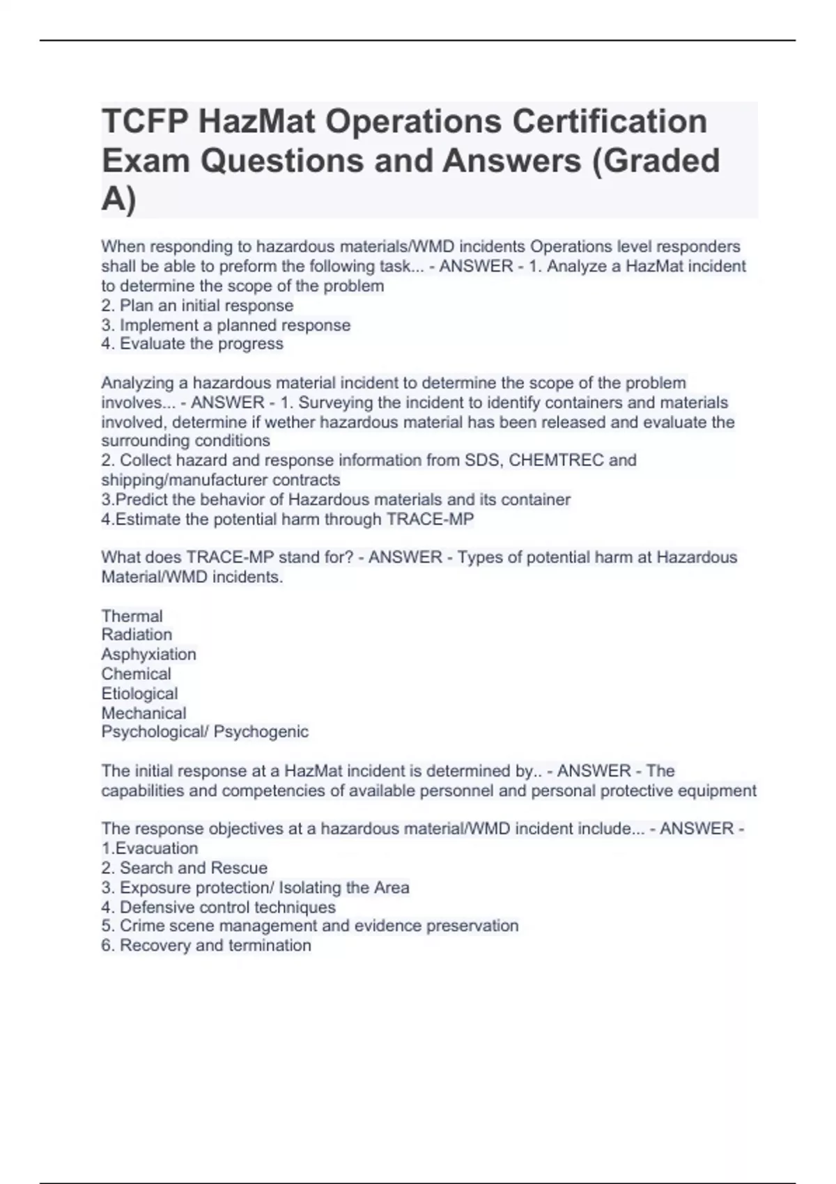 TCFP HazMat Operations Certification Exam Questions and Answers (Graded A)TCFP HazMat Operations Certification Exam Questions and Answers (Graded A)TCFP HazMat Operations Certification Exam Questions and Answers (Graded A)TCFP HazMat Operations Certification Exam Questions and Answers (Graded A) When responding to hazardous materials/WMD incidents Operations level responders shall be able to preform the following task... - ANSWER - 1. Analyze a HazMat incident to determine the scope of the problem 2. Plan an initial response 3. Implement a planned response 4. Evaluate the progress Analyzing a hazardous material incident to determine the scope of the problem involves... - ANSWER - 1. Surveying the incident to identify containers and materials involved, determine if wether hazardous material has been released and evaluate the surrounding conditions 2. Collect hazard and response information from SDS, CHEMTREC and shipping/manufacturer contracts 3.Predict the behavior of Hazardous materials and its container 4.Estimate the potential harm through TRACE-MP What does TRACE-MP stand for? - ANSWER - Types of potential harm at Hazardous Material/WMD incidents. Thermal Radiation Asphyxiation Chemical Etiological Mechanical Psychological/ Psychogenic The initial response at a HazMat incident is determined by.. - ANSWER - The capabilities and competencies of available personnel and personal protective equipment The response objectives at a hazardous material/WMD incident include... - ANSWER - 1.Evacuation 2. Search and Rescue 3. Exposure protection/ Isolating the Area 4. Defensive control techniques 5. Crime scene management and evidence preservation 6. Recovery and termination