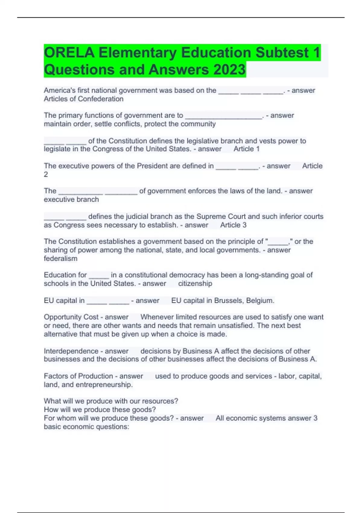 ORELA Elementary Education Subtest 1 Questions and Answers 2023
