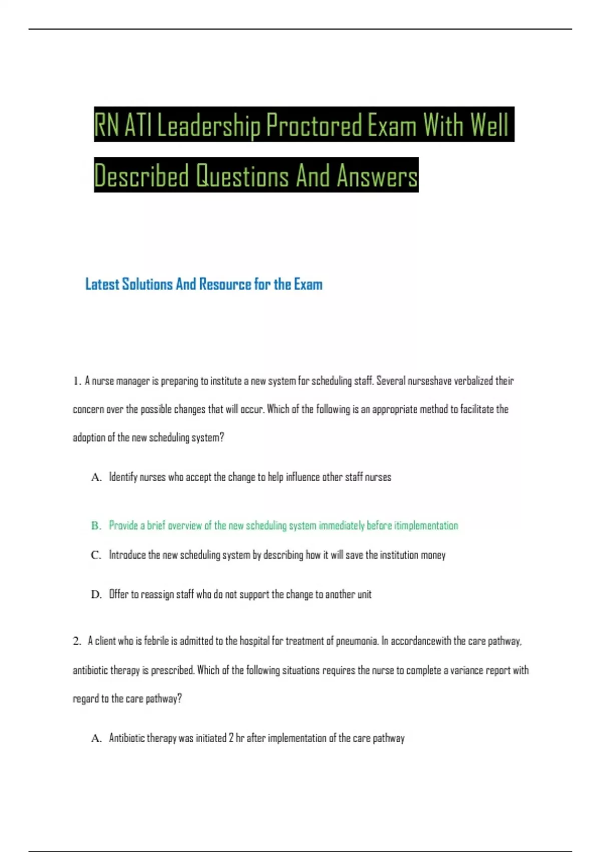 RN ATILeadership ProctoredExam With Well Described Questions And Answers Latest Solutions And Resource forthe Exam 1. A nurse manager is preparing toinstitute anew system forschedulingstaff. Severalnurseshaveverbalized their concern over the possible changes that will occur. Which of the following is anappropriate method tofacilitate the adoption of the new schedulingsystem? A. Identifynurses whoaccept thechange tohelp influence otherstaff nurses B. Providea brief overview of thenew schedulingsystem immediatelybefore itimplementation C. Introducethe new schedulingsystem bydescribing how it will save the institution money D. Offer toreassignstaff whodonot support thechange toanother unit 2. A client whois febrileis admittedtothehospital for treatmentof pneumonia. In accordancewith the care pathway, antibiotic therapy is prescribed. Which of the following situations requires thenurse tocomplete avariance report with regard to the carepathway? A. Antibiotictherapy was initiated 2hr after implementation of the care pathway B. A blood culture was obtained after antibiotic therapyhas been initiated C. The routeof antibiotic therapyonthe care pathway was changed from IVto PO D. Anallergytopenicillin requiredan alternative antibiotic tobeprescribed. 3. A nurseshould recognize that an incident report is required when A. A client refuses to attend physical therapy B. A visitor pinches his finger in the client‟s bed frame C. A client throws a box of tissues at a nurse D. A nursegives a med 30 min late 5. Client satisfactory surveys from a med-surg unit indicate the pain is not being adequately relieved duringthe first 12 hr post-opt. The unit manager decides to identifypost-optpain as aquality indicator. Which of the following data sources will be helpful in determine the reason whyclients are not receiving adequate pain management after surgery? A. Prospectivechart audit B. Retrospectivechartaudit C. Postoperativecarepolicy D. Painassessment polic