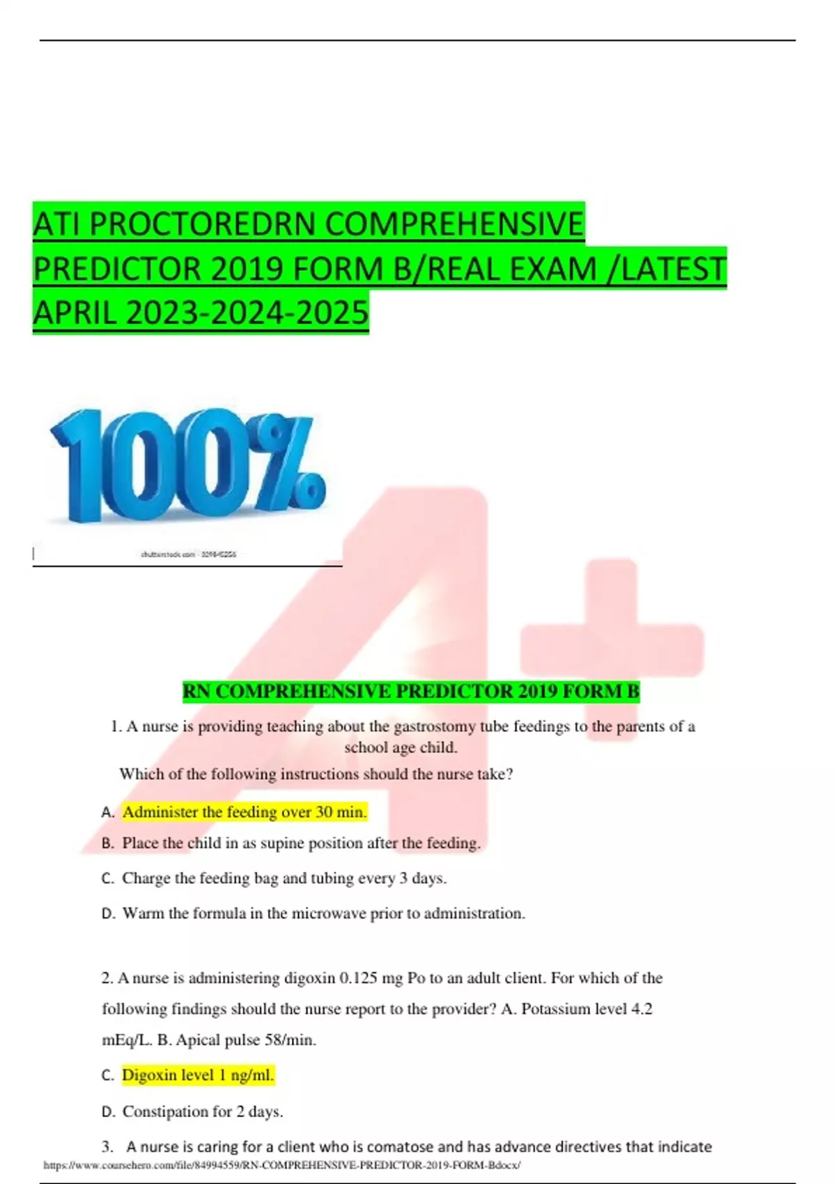 ATI PROCTOREDRN COMPREHENSIVE PREDICTOR 2019 FORM B/REAL EXAM /LATEST APRIL