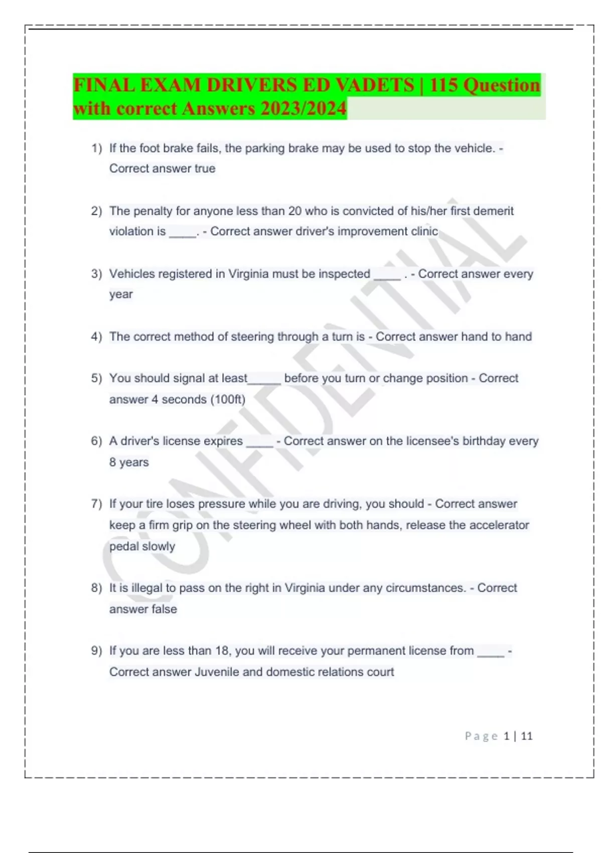 FINAL EXAM DRIVERS ED VADETS | 115 Question with correct Answers 2023/2024FINAL EXAM DRIVERS ED VADETS | 115 Question with correct Answers 2023/2024