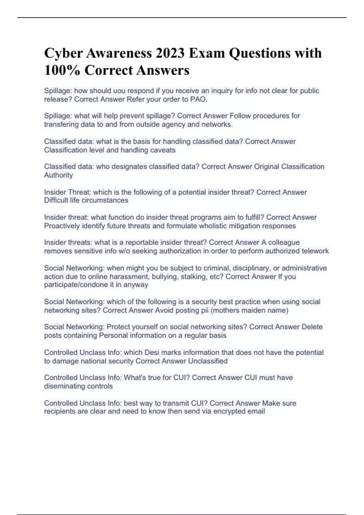 Cyber Awareness 2023 Exam Questions with 100% Correct Answers