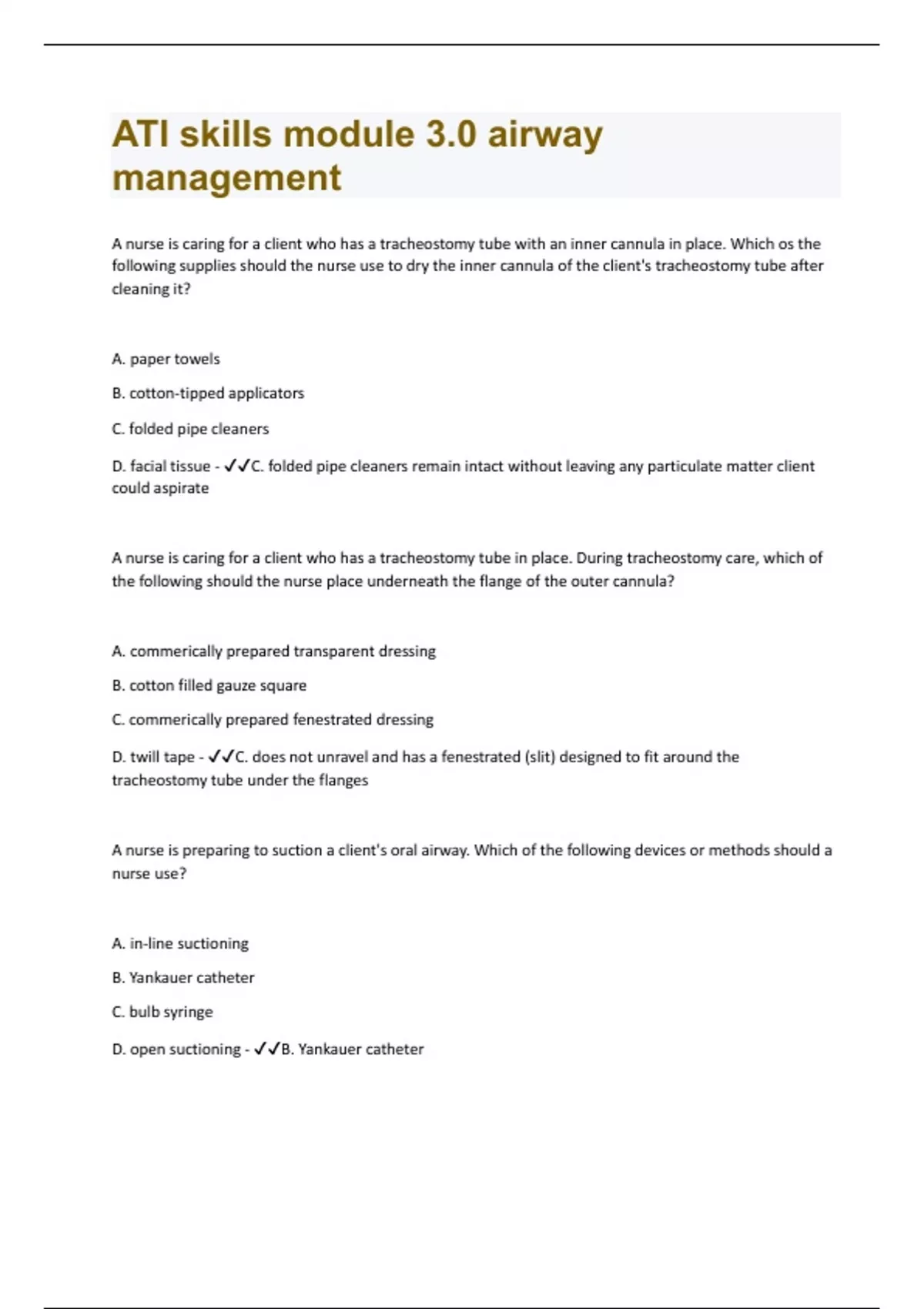 A nurse is caring for a client who has a tracheostomy tube with an inner cannula in place. Which os the following supplies should the nurse use to dry the inner cannula of the client's tracheostomy tube after cleaning it? A. paper towels B. cotton-tipped applicators C. folded pipe cleaners D. facial tissue - C. folded pipe cleaners remain intact without leaving any particulate matter client could aspirate A nurse is caring for a client who has a tracheostomy tube in place. During tracheostomy care, which of the following should the nurse place underneath the flange of the outer cannula? A. commerically prepared transparent dressing B. cotton filled gauze square C. commerically prepared fenestrated dressing D. twill tape - C. does not unravel and has a fenestrated (slit) designed to fit around the tracheostomy tube under the flanges A nurse is preparing to suction a client's oral airway. Which of the following devices or methods should a nurse use? A. in-line suctioning B. Yankauer catheter C. bulb syringe D. open suctioning - B. Yankauer catheter