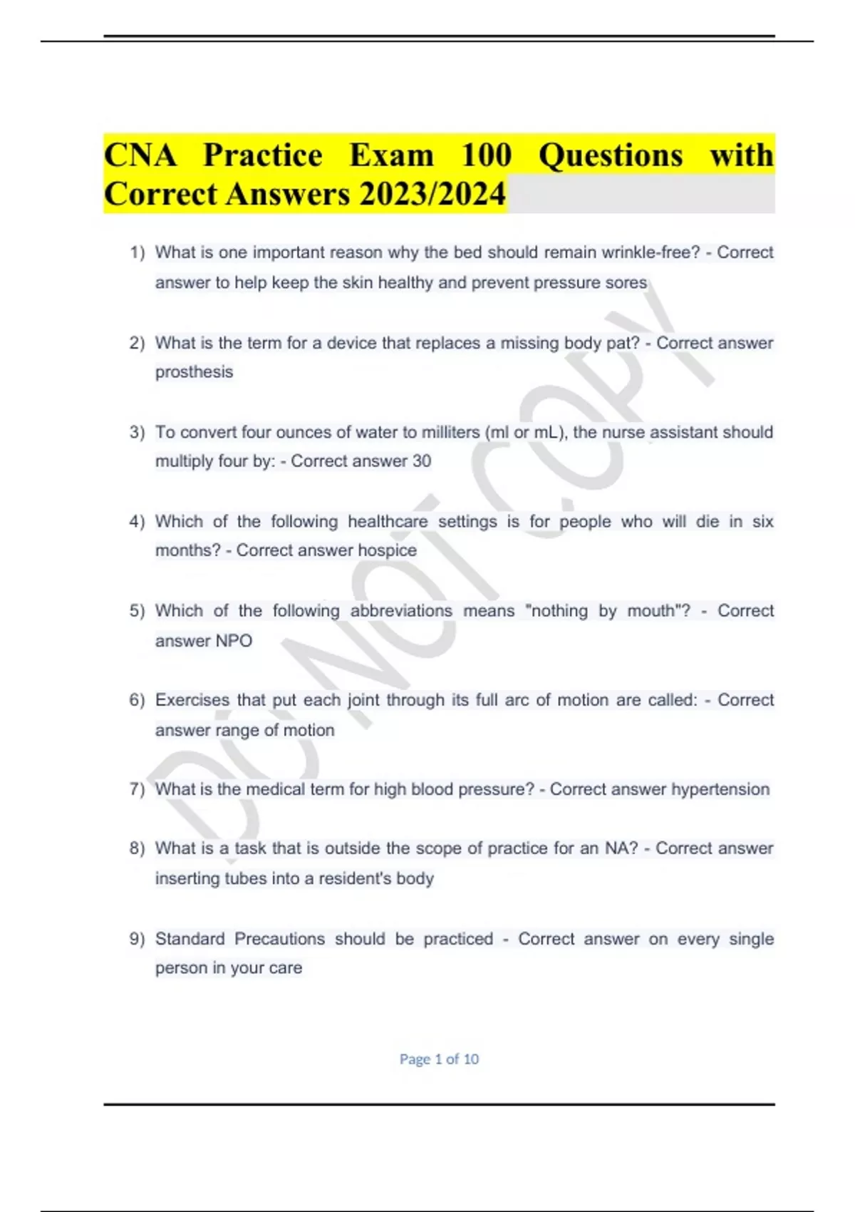 CNA Practice Exam 100 Questions with Correct Answers 2023/2024CNA Practice Exam 100 Questions with Correct Answers 2023/2024