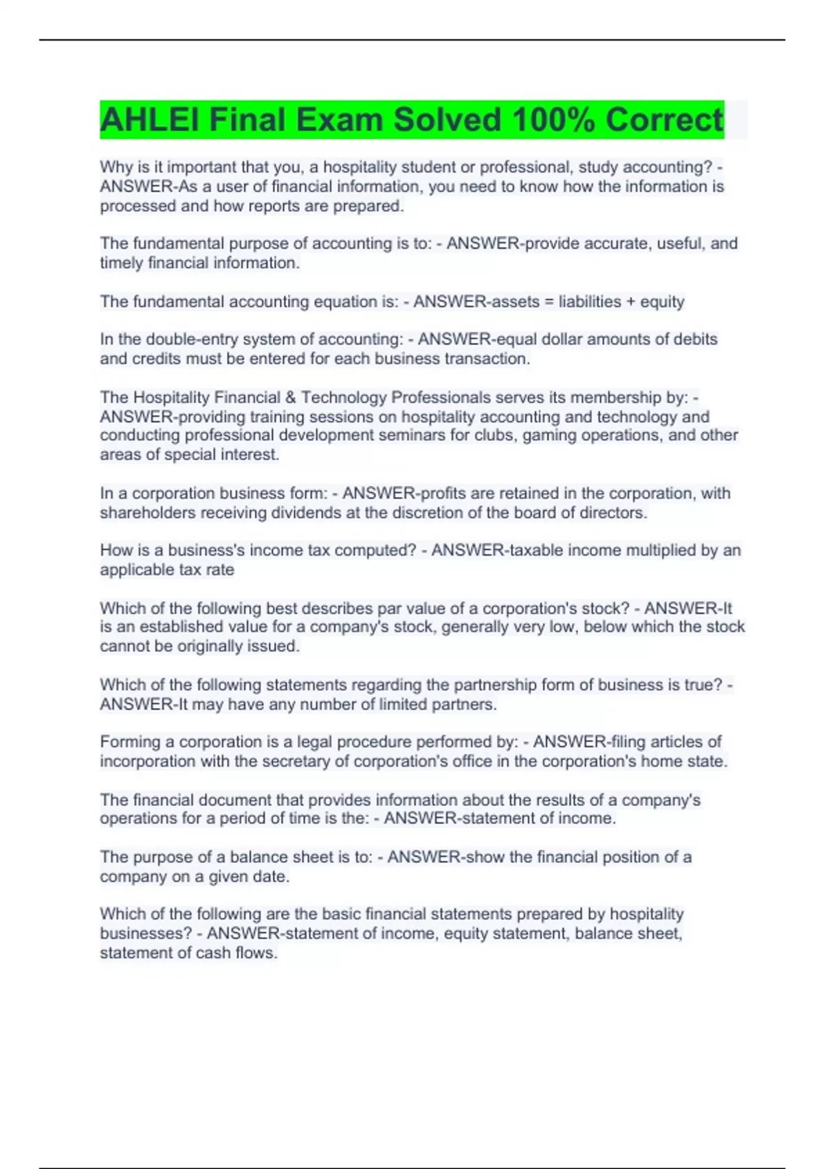Why is it important that you, a hospitality student or professional, study accounting? - ANSWER-As a user of financial information, you need to know how the information is processed and how reports are prepared. The fundamental purpose of accounting is to: - ANSWER-provide accurate, useful, and timely financial information. The fundamental accounting equation is: - ANSWER-assets = liabilities + equity In the double-entry system of accounting: - ANSWER-equal dollar amounts of debits and credits must be entered for each business transaction. The Hospitality Financial & Technology Professionals serves its membership by: - ANSWER-providing training sessions on hospitality accounting and technology and conducting professional development seminars for clubs, gaming operations, and other areas of special interest. In a corporation business form: - ANSWER-profits are retained in the corporation, with shareholders receiving dividends at the discretion of the board of directors. How is a business's income tax computed? - ANSWER-taxable income multiplied by an applicable tax rate Which of the following best describes par value of a corporation's stock? - ANSWER-It is an established value for a company's stock, generally very low, below which the stock cannot be originally issued. Which of the following statements regarding the partnership form of business is true? - ANSWER-It may have any number of limited partners. Forming a corporation is a legal procedure performed by: - ANSWER-filing articles of incorporation with the secretary of corporation's office in the corporation's home state. The financial document that provides information about the results of a company's operations for a period of time is the: - ANSWER-statement of income. The purpose of a balance sheet is to: - ANSWER-show the financial position of a company on a given date. Which of the following are the basic financial statements prepared by hospitality businesses? - ANSWER-statement of income, equity statement, balance sheet, statement of cash flows.