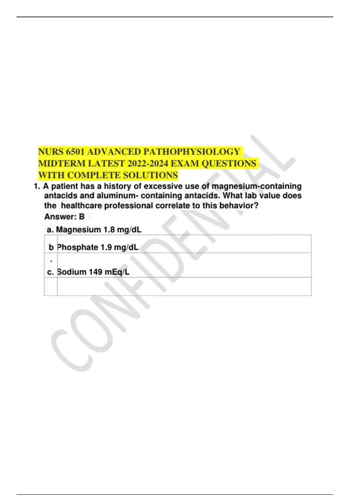 NURS 6501 ADVANCED PATHOPHYSIOLOGY MIDTERM LATEST EXAM QUESTIONS WITH COMPLETE SOLUTIONS 1. A patient has a history of excessive use of magnesium-containing antacids and aluminum- containing antacids. What lab value does the healthcare professional correlate to this behavior? Answer: B a. Magnesium 1.8 mg/dL b Phosphate 1.9 mg/dL . c. Sodium 149 mEq/L d. Potassium 2.5 mEq/L 2. the diet ? Answer: B 3. In h of thecolon, uterus, and kidney? or does the ty of cancer