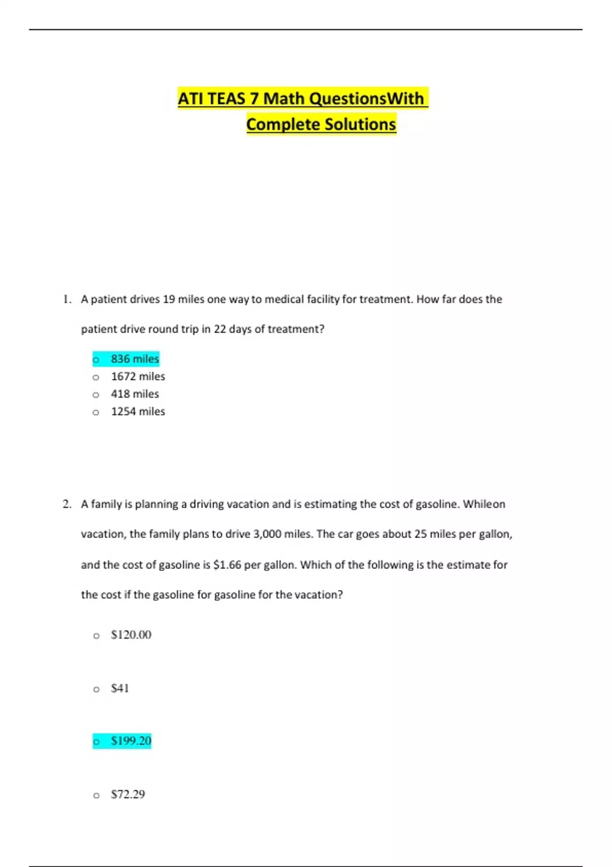 ATI TEAS 7 Math QuestionsWith Complete Solutions 1. A patient drives 19 miles one way to medical facility for treatment. How far does the patient drive round trip in 22 days of treatment? o 836 miles o 1672 miles o 418 miles o 1254 miles 2. A family is planning a driving vacation and is estimating the cost of gasoline. Whileon vacation, the family plans to drive 3,000 miles. The car goes about 25 miles per gallon, and the cost of gasoline is $1.66 per gallon. Which of the following is the estimate for the cost if the gasoline for gasoline for the vacation? o $120.00 o $41 o $199.20 o $72.29 3. To determine the insurance premium of a car, an insurance company considers the following determinants the age of the car, the model of the car, and mileage of the car. Which of following is the dependent variable? o Insurance premium o Age o Model o Mileage 4. Graph indicating price in thousands of dollars and years between 1984 and 2016. Following the trend, the estimated average price of a home in 2016 would be $140,000. 5. Simplify the expression below. (18x5 yz) ÷ (6xyz4 ) (3x4 y)/ z3 3x4 yz 3 3x4 z 3 3x4 )/ z 3 6. Which of the following is the correct order of the numbers below from the least to greatest? 235.971, 145.884, -271.906, -193.823 -193.823, -271.906, 145.884, 235.971 145.884, -193.823, 235.971, -271.906 -271.906, -193.823, 145.884, 235.971 -271.906, 235.971, -193.823, 145.884 7. To rent tablecloths from a party rental vendor, there is an initial charge of $40. Thereis an additional charge of $5 per circular tablecloth and $3.50per rectangular tablecloth (r). which of the following equations represents the total cost (T) to rent tablecloths? o5C +3.5r +40 = T o 5r +3.5 + 40 = T o 5C + 3.5r -40 = T o 5r + 3.5C – 40 = T 8. Four friends are sharing a pizza. One friend eats half of the pizza. The other three friends equally divide the rest of the pizza, what did each of the other three friends receive? o ¼ o 1/6 o 1/5 o 1/