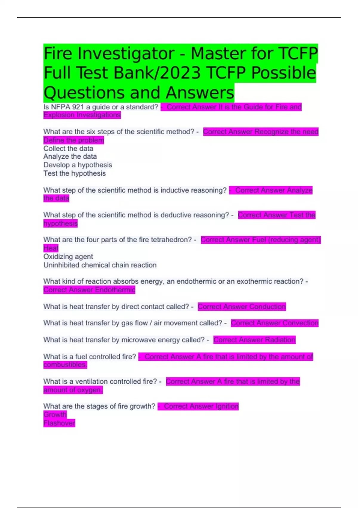 Fire Investigator - Master for TCFP Full Test Bank/2023 TCFP Possible Questions and Answers Is NFPA 921 a guide or a standard? - Correct Answer It is the Guide for Fire and Explosion Investigations What are the six steps of the scientific method? - Correct Answer Recognize the need Define the problem Collect the data Analyze the data Develop a hypothesis Test the hypothesis What step of the scientific method is inductive reasoning? - Correct Answer Analyze the data What step of the scientific method is deductive reasoning? - Correct Answer Test the hypothesis What are the four parts of the fire tetrahedron? - Correct Answer Fuel (reducing agent) Heat Oxidizing agent Uninhibited chemical chain reaction What kind of reaction absorbs energy, an endothermic or an exothermic reaction? - Correct Answer Endothermic What is heat transfer by direct contact called? - Correct Answer Conduction What is heat transfer by gas flow / air movement called? - Correct Answer Convection What is heat transfer by microwave energy called? - Correct Answer Radiation What is a fuel controlled fire? - Correct Answer A fire that is limited by the amount of combustibles. What is a ventilation controlled fire? - Correct Answer A fire that is limited by the amount of oxygen. What are the stages of fire growth? - Correct Answer Ignition Growth Flashover
