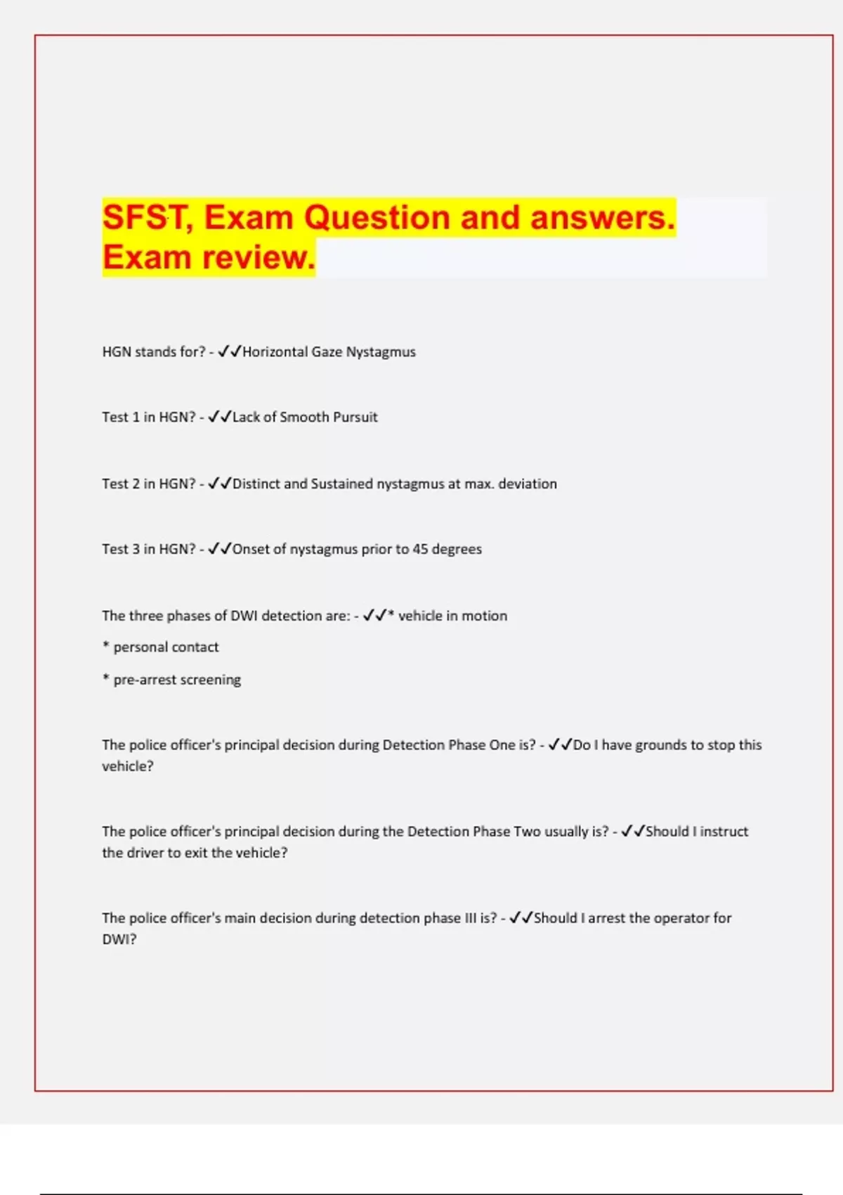 SFST, Exam Question and answers. Exam review.