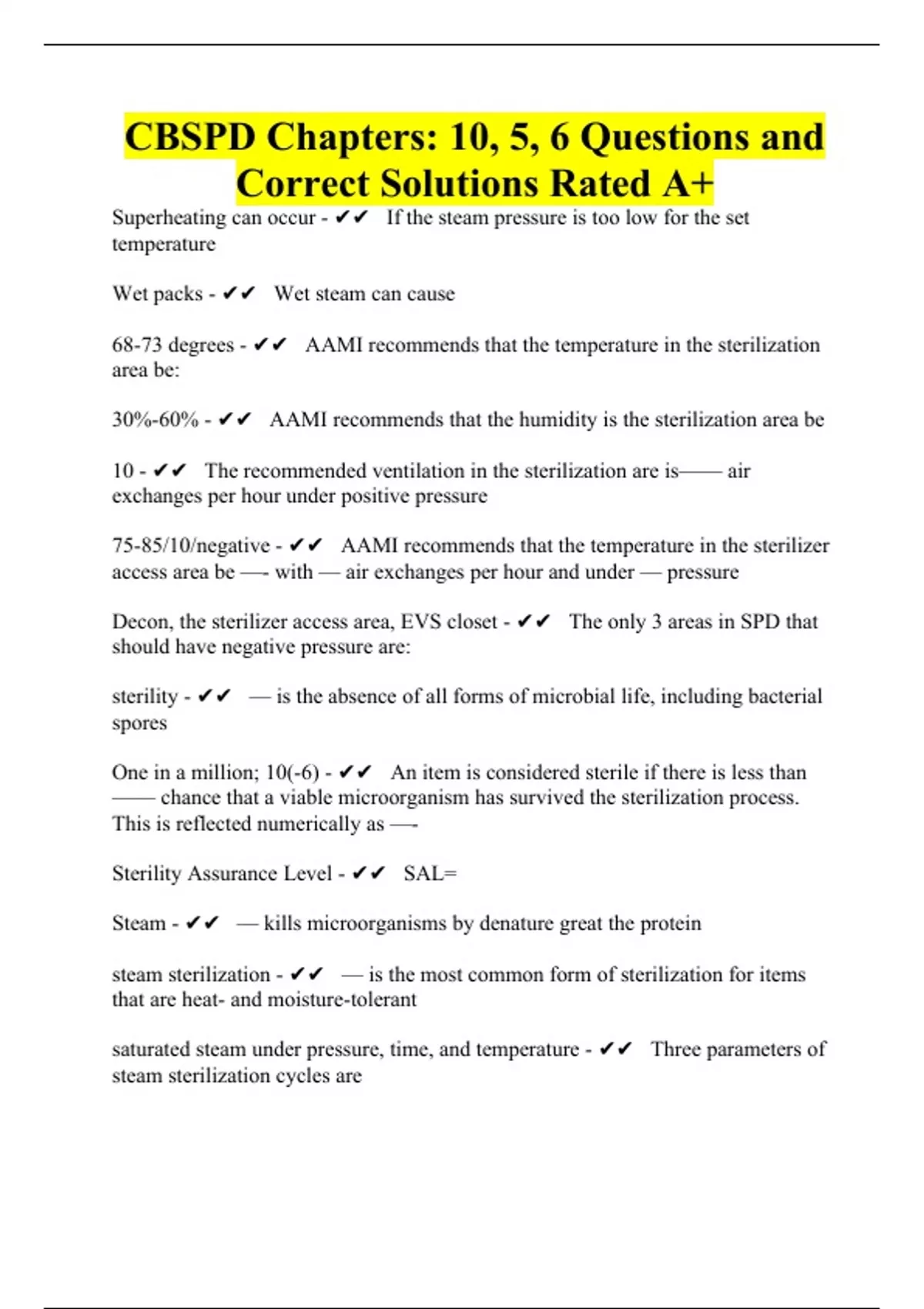 Superheating can occur - If the steam pressure is too low for the set temperature Wet packs - Wet steam can cause 68-73 degrees - AAMI recommends that the temperature in the sterilization area be: 30%-60% - AAMI recommends that the humidity is the sterilization area be 10 - The recommended ventilation in the sterilization are is—— air exchanges per hour under positive pressure 75-85/10/negative - AAMI recommends that the temperature in the sterilizer access area be —- with — air exchanges per hour and under — pressure Decon, the sterilizer access area, EVS closet - The only 3 areas in SPD that should have negative pressure are: sterility - — is the absence of all forms of microbial life, including bacterial spores One in a million; 10(-6) - An item is considered sterile if there is less than —— chance that a viable microorganism has survived the sterilization process. This is reflected numerically as —- Sterility Assurance Level - SAL= Steam - — kills microorganisms by denature great the protein steam sterilization - — is the most common form of sterilization for items that are heat- and moisture-tolerant saturated steam under pressure, time, and temperature - Three parameters of steam sterilization cycles are Dynamic-air-removal cycles - — are used in prevacuum sterilized and in steam-flush pressure-pulse (SFPP) Prevacuum sterilizers - — remove air by drawing series of vacuums with an injection of steam between each vacuum pull. Bowie-Dick test - Performed daily to detect air leaks or inadequate air removal from prevacuum sterilzers Gravity-displacement cycles - Incoming steam displaces residual air through the drain at the bottom of the sterilizer chamber: Gravity-displacement - Because there is no mechanical air removal in a —, a Bowie-Dick test is not required for — or sterilizers Boiler - In most healthcare facilities, steam is generated inside of a: 60-80psig - The required pressure of steam as it enters the jacket is usually: 28-30 lbs of pressure - For a sterilizer operating at 270 degrees, the sterilizer gauge will show: An insulating jacket - Provides heat inside the chamber to prevent condensation from forming on the chamber walls: Heat-sensing thermometer - The sterilizers - - - is locates in the drain line The drain line - The coldest part of sterilizer is Bottom rack, drain line - All PCDs should be placed on the —, directly over the — On the bottom rack above the drain line - The Bowie-Dick test pack is placed Conditioning, sterilization/exposure/"holding, Exhaust, Drying - The phases of steam sterilization cycles are: Conditioning phase - During this phase, air is removed from the sterilization chamber and steam is injected Sterilization/exposure/holding - In this phase, the exposure temperature is maintained for the prescribed amount of time. Exhausted, Exhaust phase - After the exposure phase, steam is — from the sterilizer through the chamber drain line is this phase: Drying phase - After the steam has been exhausted, the sterilizer goes into the - of the cycle which typically lasts about 30 minutes • 4 minutes @ 270 and 28-30 psi • 3 minutes @ 275 and 38-30 psi - The cycle for wrapped items using Dynamic-air-removal steam is: • 30 minutes @ 350 and 15 psi • 15-20 minutes @ 270 and 27 psi • 10 minutes @ 275 and 30 psi - The cycle for wrapped items using Gravity-displacement steam: BI PCD - To verify that the cycle met the requirements for sterilization, a — should be included in the load (whether or not the load contains implantable devices) Immediate-Use steam sterilization (IUSS) - —- is usually performed when an unplanned event occurs Rigid sterilization container - AORN recommends that IUSS be performed in a IUSS — thAt has been validated and FDA cleared for IUSS cycles Metal items only; no porous or lumened items: 270 or 275 for 3 minutes Metal items with lumens and/or porous items: 270 or 275 for 4 minutes - IUSS cycles for unwrapped items are as follows: (dynamic-air-removal) Metal items only; no porous or lumened items: 270 or 275 for 3 minutes Metal items with lumens and/or porous items: 270 or 275 for 10 minutes - IUSS cycles for unwrapped items are as follows: (gravity-displacement) 1. Cleaning and decontamination 2. Sterilization 3. Storage or return to the sterile field - The 3 critical steps of reprocessing are: 18 minutes @ 274 in a prevacuum steam sterilizer Or 1 hour @ 250 in a gravity- displacement steam sterilizer - The minimum exposure time for processing instruments used on patients with CJD is: Neurosurgical and ophthalmology - Many — and — instrument manufacturers have validated their instruments for prion-contaminated device cycles Patient ID, date instruments were used, procedure performed and surgeons name - A tracking system for patients at risk of CJD should include: Gravity-displacement liquids cycle - Liquids can be processed only in a: Steam sterilization - Heat + moisture = Condensation - Steam sterilization occurs by: Superheating - — occurs when saturated steam at any given temperature is subjected to a higher temperature...this occurs when heat is added to dry steam in the absence of water