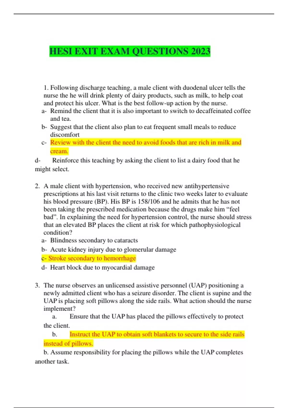 HESI EXIT EXAM QUESTIONS 2023 1. Following discharge teaching, a male client with duodenal ulcer tells the nurse the he will drink plenty of dairy products, such as milk, to help coat and protect his ulcer. What is the best follow-up action by the nurse.