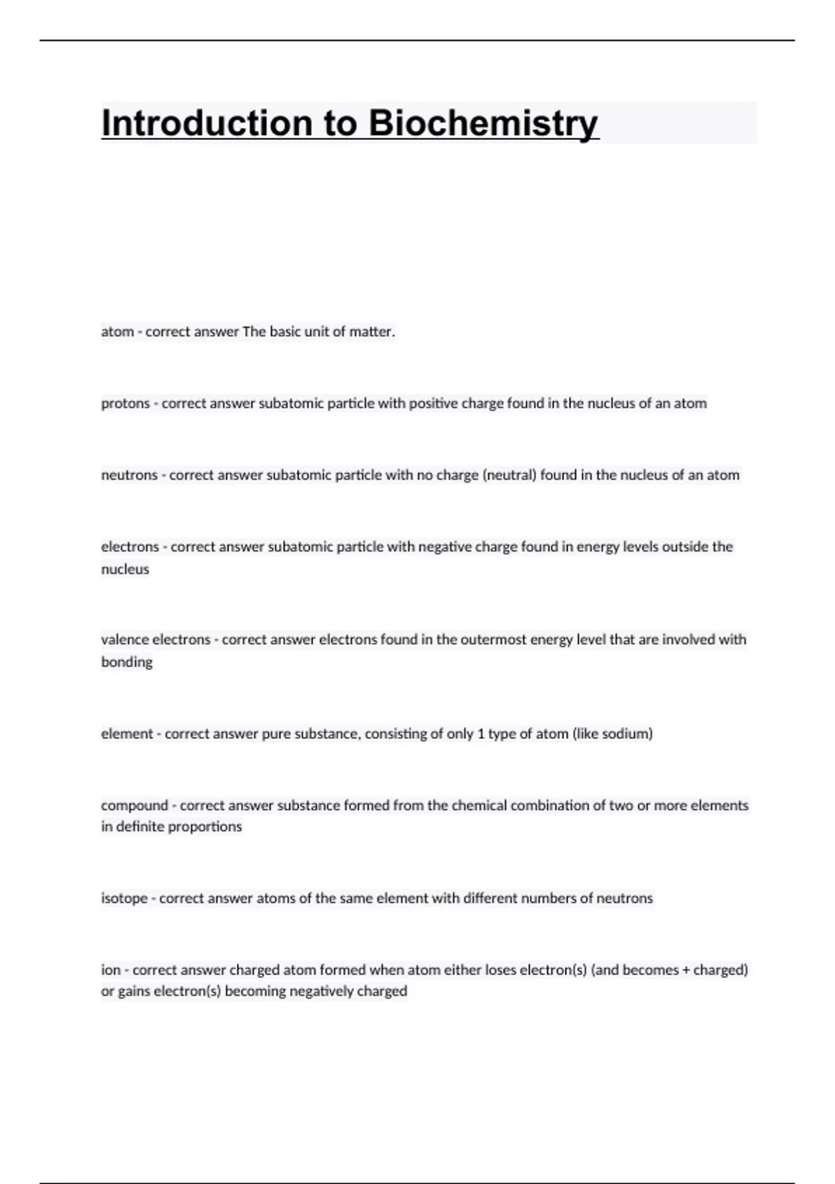 introduction to biochemistry with correct answers