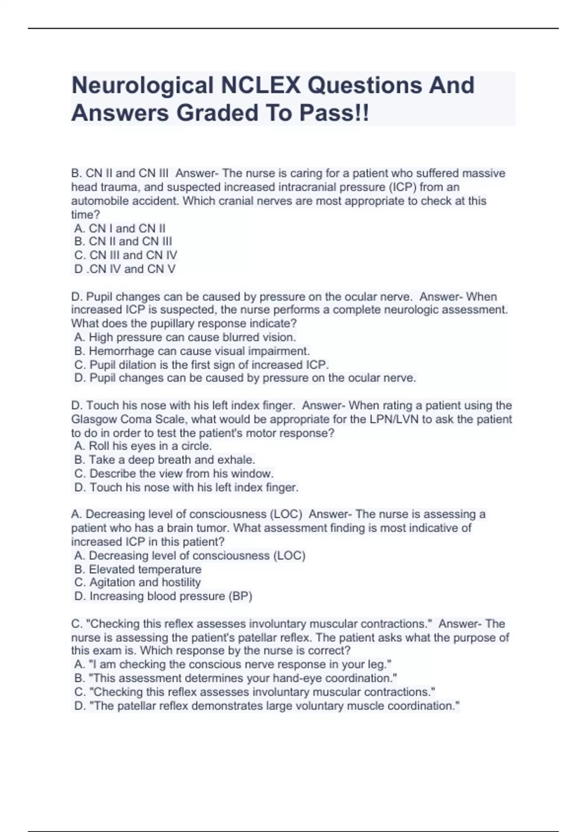 neurological nclex questions and answers graded to