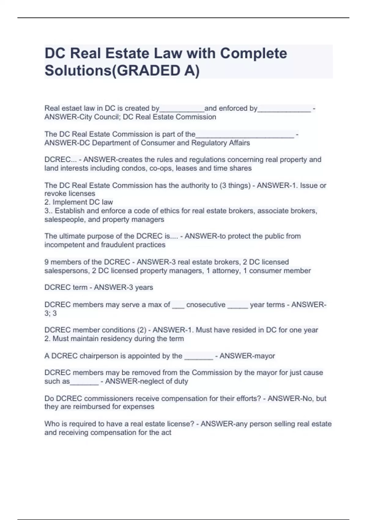Real estaet law in DC is created by___________and enforced by_____________ - ANSWER-City Council; DC Real Estate Commission The DC Real Estate Commission is part of the________________________ - ANSWER-DC Department of Consumer and Regulatory Affairs DCREC... - ANSWER-creates the rules and regulations concerning real property and land interests including condos, co-ops, leases and time shares The DC Real Estate Commission has the authority to (3 things) - ANSWER-1. Issue or revoke licenses 2. Implement DC law 3.. Establish and enforce a code of ethics for real estate brokers, associate brokers, salespeople, and property managers The ultimate purpose of the DCREC is.... - ANSWER-to protect the public from incompetent and fraudulent practices 9 members of the DCREC - ANSWER-3 real estate brokers, 2 DC licensed salespersons, 2 DC licensed property managers, 1 attorney, 1 consumer member DCREC term - ANSWER-3 years DCREC members may serve a max of ___ cnosecutive _____ year terms - ANSWER-3; 3 DCREC member conditions (2) - ANSWER-1. Must have resided in DC for one year 2. Must maintain residency during the term A DCREC chairperson is appointed by the _______ - ANSWER-mayor DCREC members may be removed from the Commission by the mayor for just cause such as_______ - ANSWER-neglect of duty Do DCREC commissioners receive compensation for their efforts? - ANSWER-No, but they are reimbursed for expenses Who is required to have a real estate license? - ANSWER-any person selling real estate and receiving comp DC Real Estate Law with Complete Solutions(GRADED A)