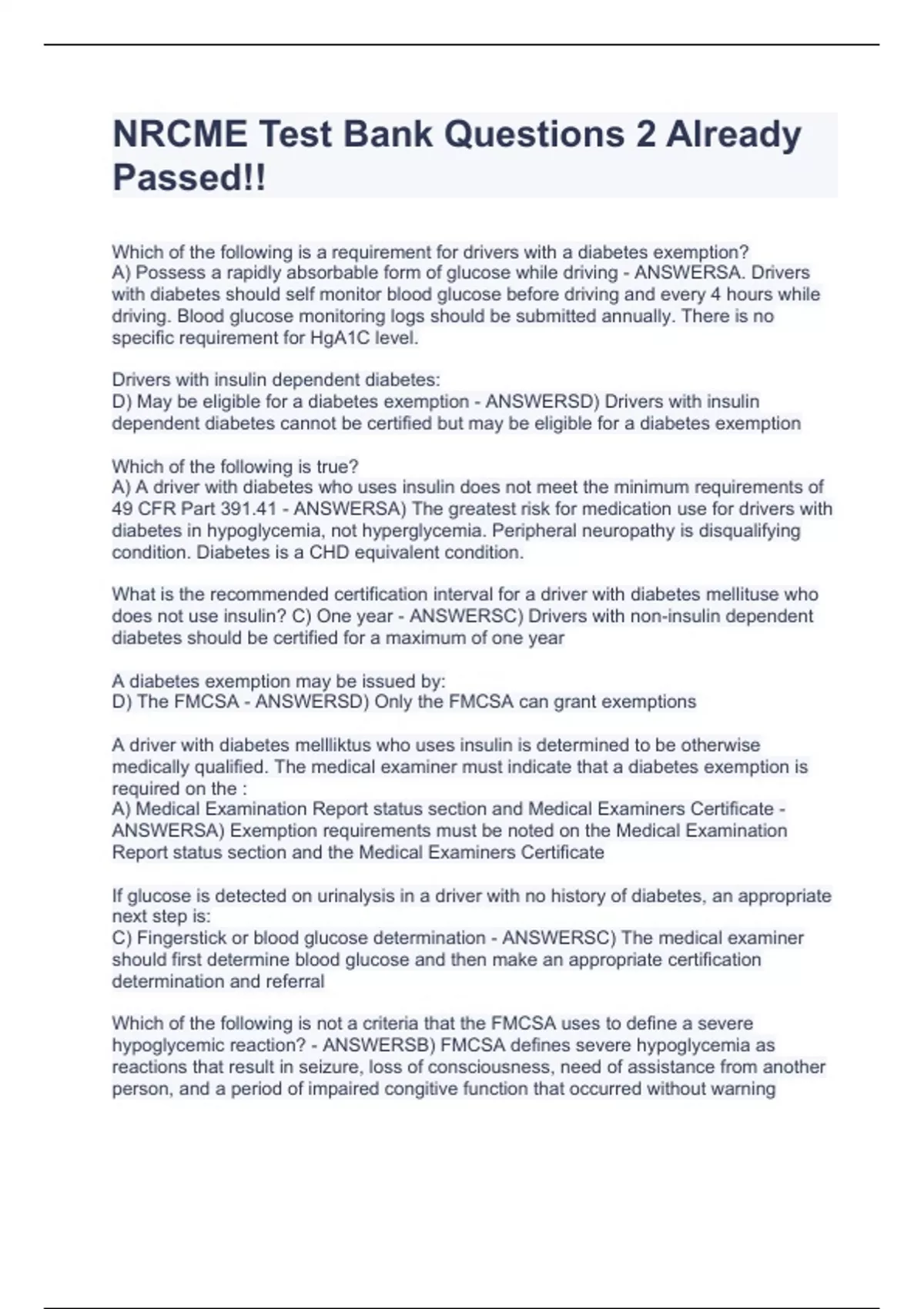 Which of the following is a requirement for drivers with a diabetes exemption? A) Possess a rapidly absorbable form of glucose while driving - ANSWERSA. Drivers with diabetes should self monitor blood glucose before driving and every 4 hours while driving. Blood glucose monitoring logs should be submitted annually. There is no specific requirement for HgA1C level. Drivers with insulin dependent diabetes: D) May be eligible for a diabetes exemption - ANSWERSD) Drivers with insulin dependent diabetes cannot be certified but may be eligible for a diabetes exemption Which of the following is true? A) A driver with diabetes who uses insulin does not meet the minimum requirements of 49 CFR Part 391.41 - ANSWERSA) The greatest risk for medication use for drivers with diabetes in hypoglycemia, not hyperglycemia. Peripheral neuropathy is disqualifying condition. Diabetes is a CHD equivalent condition. What is the recommended certification interval for a driver with diabetes mellituse who does not use insulin? C) One year - ANSWERSC) Drivers with non-insulin dependent diabetes should be certified for a maximum of one year A diabetes exemption may be issued by: D) The FMCSA - ANSWERSD) Only the FMCSA can grant exemptions A driver with diabetes mellliktus who uses insulin is determined to be otherwise medically qualified. The medical examiner must indicate that a diabetes exemption is required on the : A) Medical Examination Report status section and Medical Examiners Certificate - ANSWERSA) Exemption requirements must be noted on the Medical Examination Report status section and the Medical Examiners Certificate If glucose is detected on urinalysis in a driver with no history of diabetes, an appropriate next step is: C) Fingerstick or blood glucose determination - ANSWERSC) The medical examiner should first determine blood glucose and then make an appropriate certification determination and referral Which of the following is not a criteria that the FMCSA uses to define a severe hypoglycemic reaction? - ANSWERSB) FMCSA defines severe hypoglycemia as reactions that result in seizure, loss of consciousness, need of assistance from another person, and a period of impaired congitive function that occurred without warning Drivers with a history of _____________ severe hypoglycemic reactions in the past year or _____________ severe hypoglycemic reactions in the past five years should not be certified. B) one, two - ANSWERSB) A driver should not be certified if the driver has had one hypoglycemic reaction in the past year or two in the past five years. Which diabetes mellitus risk poses the greatest threat to public safety C) Hypoglycemia - ANSWERSC) Although hyperglycemia, peripheral neuropathy, and metabolic encephalopathy all pose significant risks for safe driving, hypoglycemia poses the greatest risk. The risk is particularly pronounced in drivers who use insulin. FMCSA defines a hypoglycemia episode as one that results in seizure, loss of consciousness, need of assistance from another person,