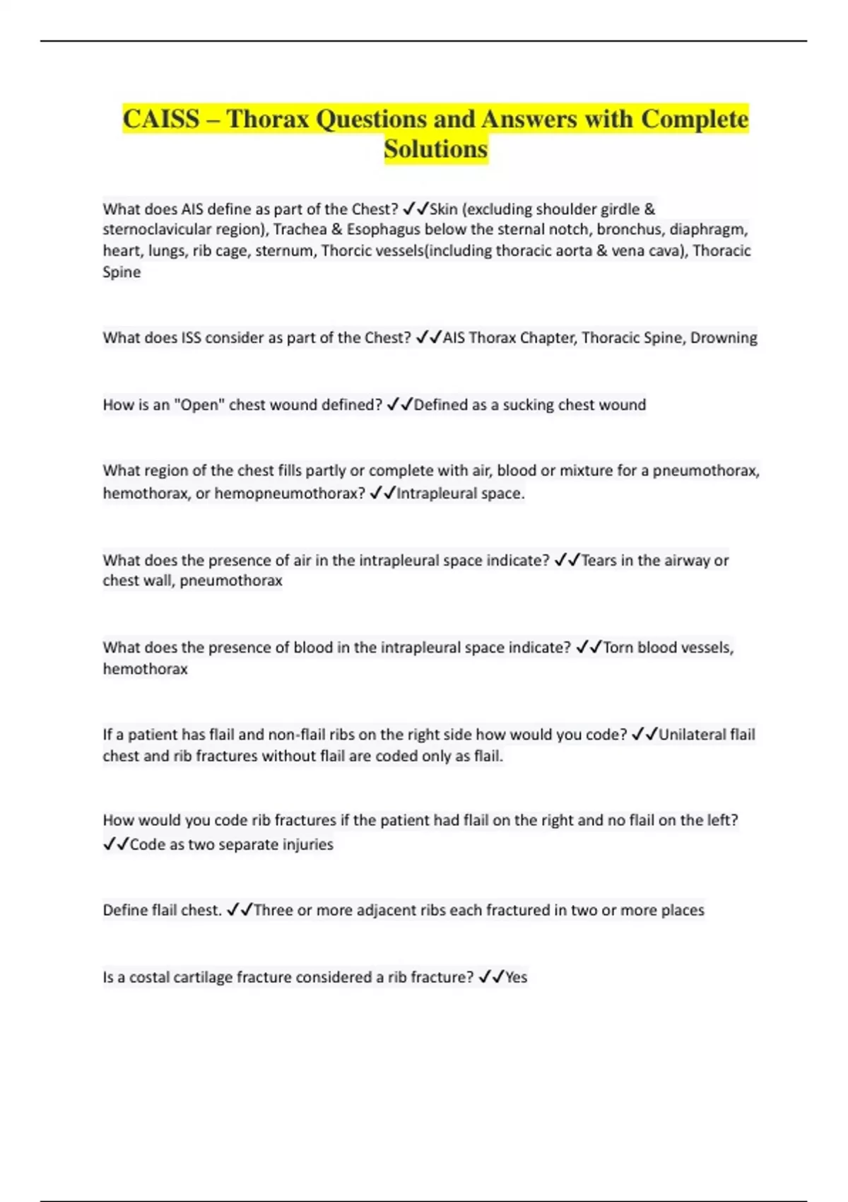 CAISS – Thorax Questions and Answers with Complete Solutions What does AIS define as part of the Chest? Skin (excluding shoulder girdle & sternoclavicular region), Trachea & Esophagus below the sternal notch, bronchus, diaphragm, heart, lungs, rib cage, sternum, Thorcic vessels(including thoracic aorta & vena cava), Thoracic Spine What does ISS consider as part of the Chest? AIS Thorax Chapter, Thoracic Spine, Drowning How is an "Open" chest wound defined? Defined as a sucking chest wound What region of the chest fills partly or complete with air, blood or mixture for a pneumothorax, hemothorax, or hemopneumothorax? Intrapleural space. What does the presence of air in the intrapleural space indicate? Tears in the airway or chest wall, pneumothorax What does the presence of blood in the intrapleural space indicate? Torn blood vessels, hemothorax If a patient has flail and non-flail ribs on the right side how would you code? Unilateral flail chest and rib fractures without flail are coded only as flail. How would you code rib fractures if the patient had flail on the right and no flail on the left? Code as two separate injuries Define flail chest. Three or more adjacent ribs each fractured in two or more places Is a costal cartilage fracture considered a rib fracture? Yes What is necessary to code lung contusion? History of trauma & verified by imaging or autopsy. Can you code both a lung contusion and lung laceration? Yes. Each are considered independent injuries in the chest If chest trauma is only diagnosised by it's sequela with no specific information how would you code? Thoracic injury NFS