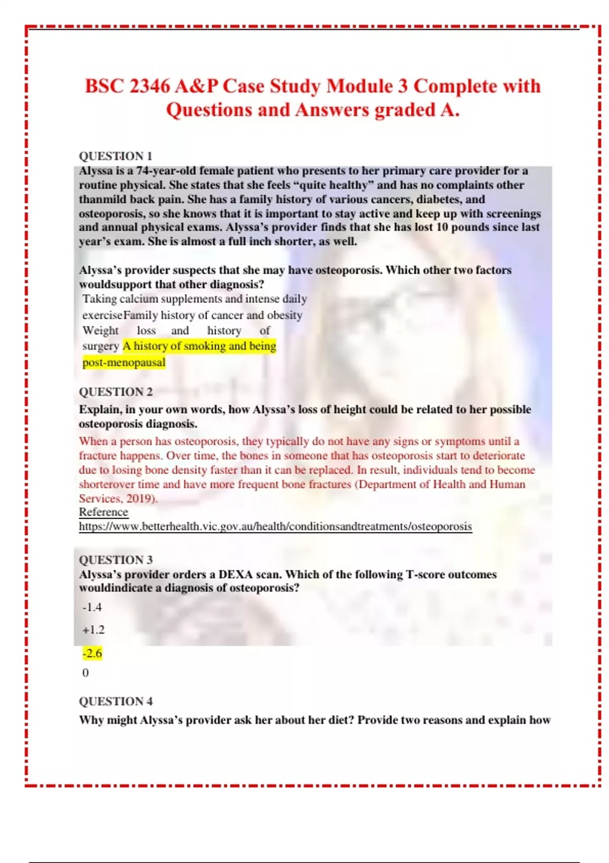 BSC 2346 A&P Case Study Module 3 Complete with Questions and Answers graded A. QUESTION 1 Alyssa is a 74-year-old female patient who presents to her primary care provider for a routine physical. She states that she feels “quite healthy” and has no complaints other than mild back pain. She has a family history of various cancers, diabetes, and osteoporosis, so she knows that it is important to stay active and keep up with screenings and annual physical exams. Alyssa’s provider finds that she has lost 10 pounds since last year’s exam. She is almost a full inch shorter, as well. Alyssa’s provider suspects that she may have osteoporosis. Which other two factors would support that other diagnosis? Taking calcium supplements and intense daily exercise Family history of cancer and obesity Weight loss and history of surgery A history of smoking and being post-menopausal QUESTION 2 Explain, in your own words, how Alyssa’s loss of height could be related to her possible osteoporosis diagnosis. When a person has osteoporosis, they typically do not have any signs or symptoms until a fracture happens. Over time, the bones in someone that has osteoporosis start to deteriorate due to losing bone density faster than it can be replaced. In result, individuals tend to become shorter over time and have more frequent bone fractures (Department of Health and Human Services, 2019). Reference QUESTION 3 Alyssa’s provider orders a DEXA scan. Which of the following T-score outcomes would indicate a diagnosis of osteoporosis? -1.4 +1.2 -2.6 0