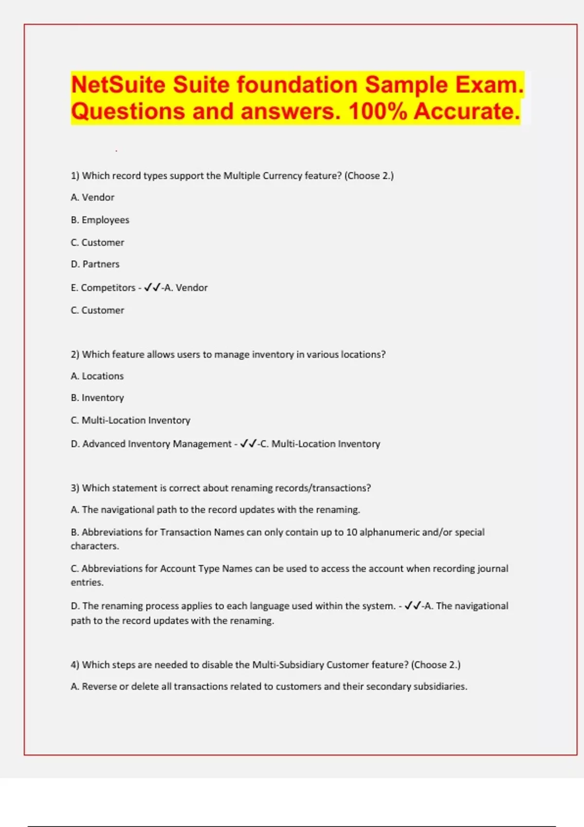NetSuite Suite foundation Sample Exam. Questions and answers. 100% Accurate. 1) Which record types support the Multiple Currency feature? (Choose 2.) A. Vendor B. Employees C. Customer D. Partners E. Competitors - -A. Vendor C. Customer 2) Which feature allows users to manage inventory in various locations? A. Locations B. Inventory C. Multi-Location Inventory D. Advanced Inventory Management - -C. Multi-Location Inventory 3) Which statement is correct about renaming records/transactions? A. The navigational path to the record updates with the renaming. B. Abbreviations for Transaction Names can only contain up to 10 alphanumeric and/or special characters. C. Abbreviations for Account Type Names can be used to access the account when recording journal entries. D. The renaming process applies to each language used within the system. - -A. The navigational path to the record updates with the renaming. 4) Which steps are needed to disable the Multi-Subsidiary Customer feature? (Choose 2.) A. Reverse or delete all transactions related to customers and their secondary subsidiaries. B. Inactivate Customer records with multiple transactions on different subsidiaries. C. Remove all secondary subsidiaries from Customer records. D. Set only one primary subsidiary and one secondary subsidiary in the Customer record. - -A. Reverse or delete all transactions related to customers and their secondary subsidiaries. C. Remove all secondary subsidiaries from Customer records. 5) Which is considered the primary classification used to organize records in a NetSuite OneWorld account? A. Departments B. Classes C. Subsidiaries D. Locations - -C. Subsidiaries 6) Which field type can be used to track Employee birthdays? A. Date B. Date/Time C. Time of Day D. Record is Parent - -A. Date 7) Which statement is true about custom forms? A. Even if a custom form is stored with a record, a user cannot access the form if it is not enabled for their role. B. If you set preferred forms without restricting them, employees can still change the form when entering records. C. The Store Form with Record option is available for all custom entry and custom transaction forms. D. Define preferred forms from Home > Set Preferences. - -B. If you set preferred forms without restricting them, employees can still change the form when entering records. 8) Which statement is correct regarding Custom Transactions? A. Custom Transaction Types can have auto-generated document numbers. B. Custom Transaction Types cannot be imported via CSV. C. Users can only create one custom form for each transaction type. D. Custom Transaction Types cannot include Custom Transaction body fields. - -A. Custom Transaction Types can have auto-generated document numbers. 9) What customization feature allows users with no scripting knowledge to modify standard NetSuite processes? A. SuiteBuilder B. SuiteFlow