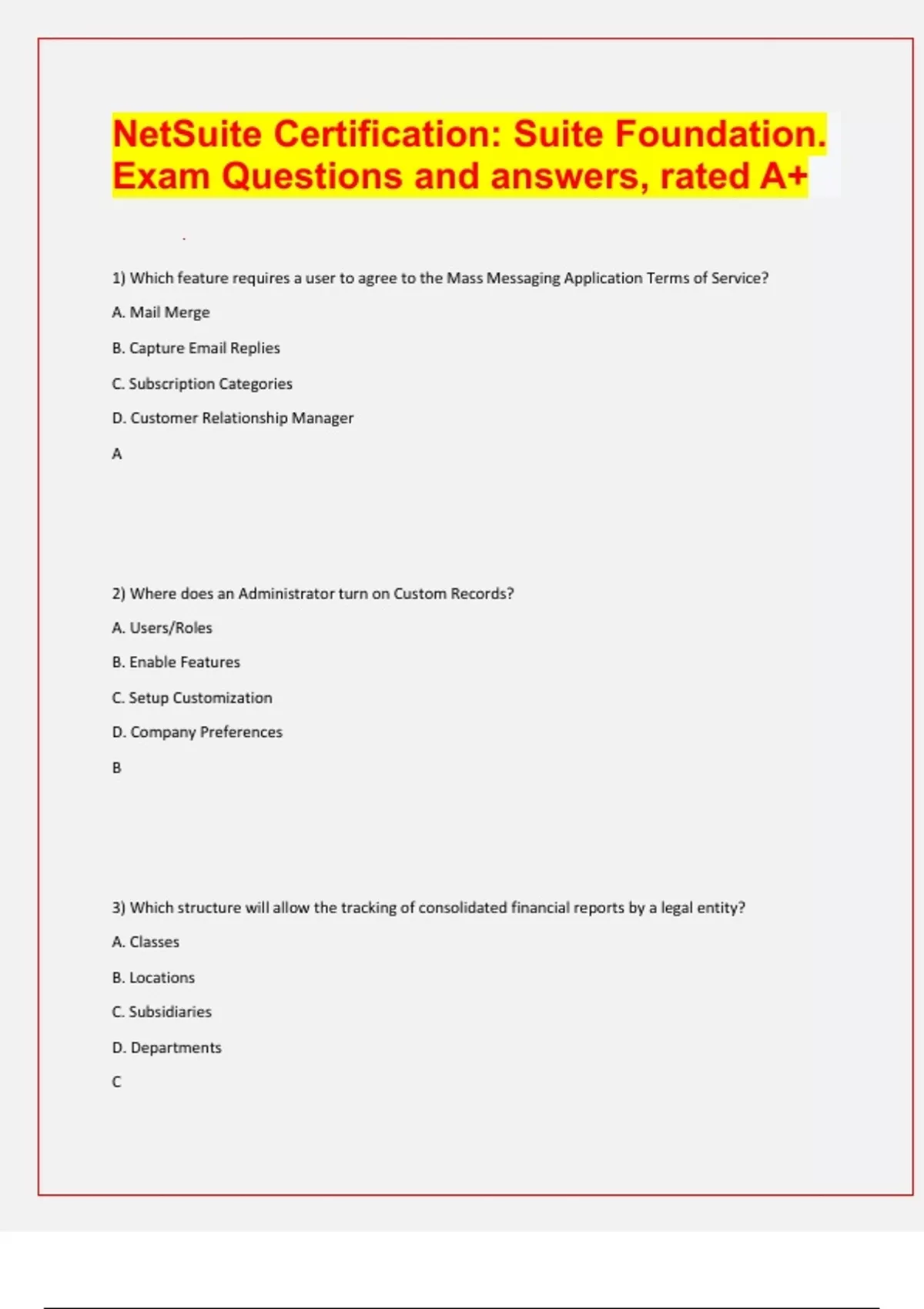 NetSuite Certification: Suite Foundation. Exam Questions and answers, rated A+ 1) Which feature requires a user to agree to the Mass Messaging Application Terms of Service? A. Mail Merge B. Capture Email Replies C. Subscription Categories D. Customer Relationship Manager A 2) Where does an Administrator turn on Custom Records? A. Users/Roles B. Enable Features C. Setup Customization D. Company Preferences B 3) Which structure will allow the tracking of consolidated financial reports by a legal entity? A. Classes B. Locations C. Subsidiaries D. Departments C 4) How can the impact of intercompany purchases and sales be offset? A. Post journals to an elimination subsidiary. B. Ensure the subsidiaries have the same parent. C. Exclude one of the subsidiaries when reporting. D. Set the same base currency in both subsidiaries. A 5) In a OneWorld account, which two steps are required to make items taxable? (choose 2) A. Assign a tax schedule on the item record. B. Set the taxable flag on the Item to "Yes". C. Create tax schedules for groups of Items. D. Add the Item to the appropriate tax schedule. A, C 6) Match the desired requirement to the most appropriate custom Field Type to use. Answer options may be used more than once or not at all. A. ___ Record formatted text B. ___ Describe something as On or Off C. ___ Connect Customers to a custom record D. ___ Record only one of several related preferences E. ___ Ability to possibly record several related preferences. 1. Radio Button 2. Multiple Select 3. Text Area 4. Check Box 5. List/Record 6. Rich Text 6, 4, 5, 5, 2 7) Order (1,2,3) the sequence that should be followed to create a custom record. A. ___ Create custom fields B. ___ Create necessary subtabs C. ___ Define record attributes and behavior first 3, 2, 1 8) Match the desired Form Customization actions with the correct option. Answer options may be used more than once or not at all. A. ___ Enable inline editing B. ___ Force a user to fill in a field C. ___ Enter information on-the-fly instead of a regular screen D. ___ Fields are presented in the same order each time a record is accessed 1. Field Group 2. Use for pop-ups 3. Mandatory 4. Store form with record 5. Enable field editing on lists 5, 3, 2, 4