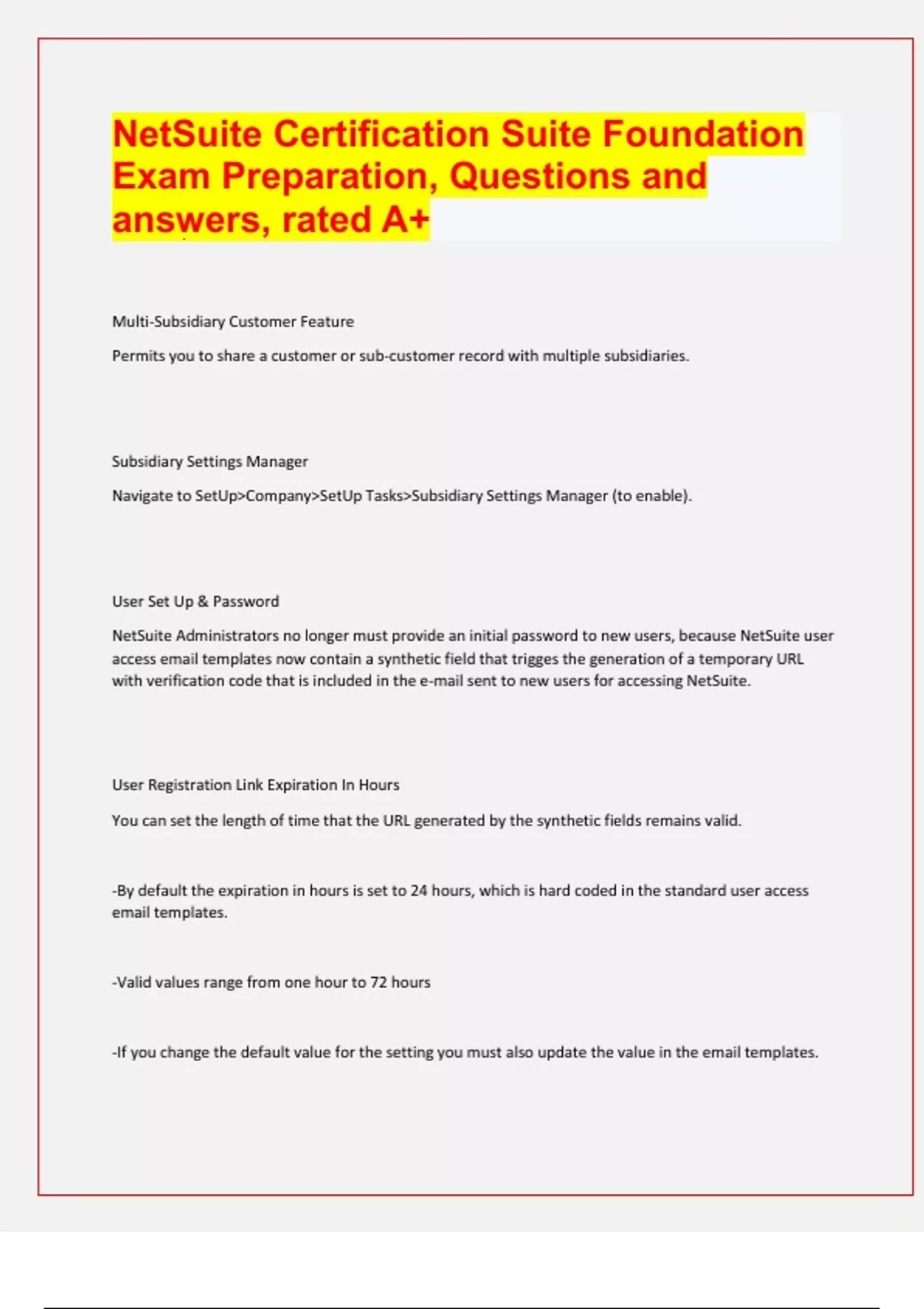 NetSuite Certification Suite Foundation Exam Preparation, Questions and answers, rated A+ Multi-Subsidiary Customer Feature Permits you to share a customer or sub-customer record with multiple subsidiaries. Subsidiary Settings Manager Navigate to SetUp>Company>SetUp Tasks>Subsidiary Settings Manager (to enable). User Set Up & Password NetSuite Administrators no longer must provide an initial password to new users, because NetSuite user access email templates now contain a synthetic field that trigges the generation of a temporary URL with verification code that is included in the e-mail sent to new users for accessing NetSuite. User Registration Link Expiration In Hours You can set the length of time that the URL generated by the synthetic fields remains valid. -By default the expiration in hours is set to 24 hours, which is hard coded in the standard user access email templates. -Valid values range from one hour to 72 hours -If you change the default value for the setting you must also update the value in the email templates. Role Restrictions You can set restrictions specific to role. Order-to-Invoice Process Transactions >Sales>Invoice Sales Orders Set Preferences Home (Button) > Set Preferences Accounting Preferences Set Up > Accounting > Accounting Preferences Sales Preferences Set Up > Sales > Sales Preferences Marketing Preferences Set Up > Marketing > Marketing Preferences Set Up Accounting Periods Lists > Accounting > Accounts > New
